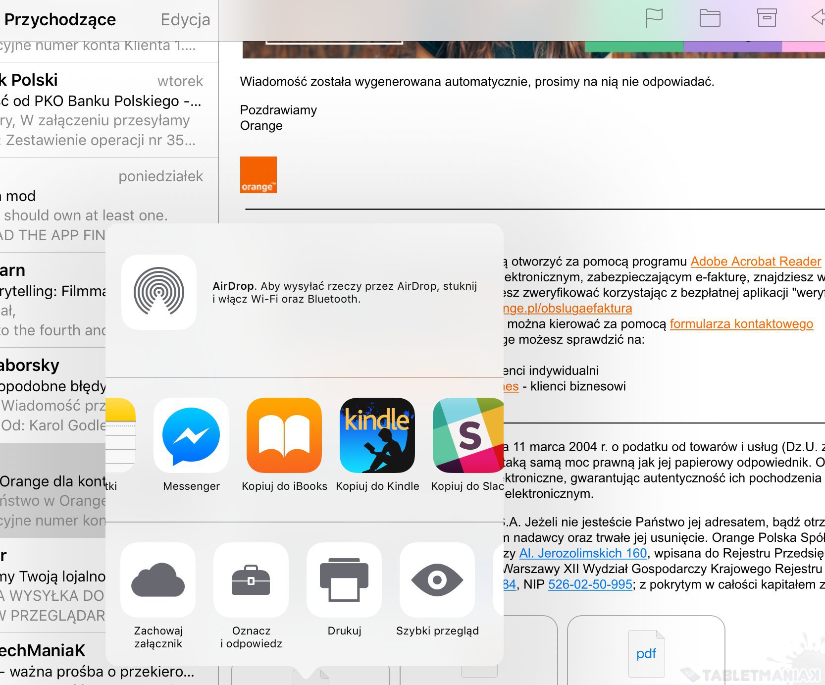 Jeśli korzystasz z poczty przy użyciu aplikacji Mail, większość załączników jest pobierana automatycznie na iPada, a Ty musisz tylko zdecydować, w jakim programie go otworzyć. Wszelkiego rodzaju zdjęcia wyświetlane są w treści maila, natomiast inne pliki posiadają ikonkę programu, z którym zostały skojarzone przez iPada. Po kliknięciu ikony pojawi nam się menu kontekstowe, gdzie znajduje się lista programów do których możemy przekopiować plik.