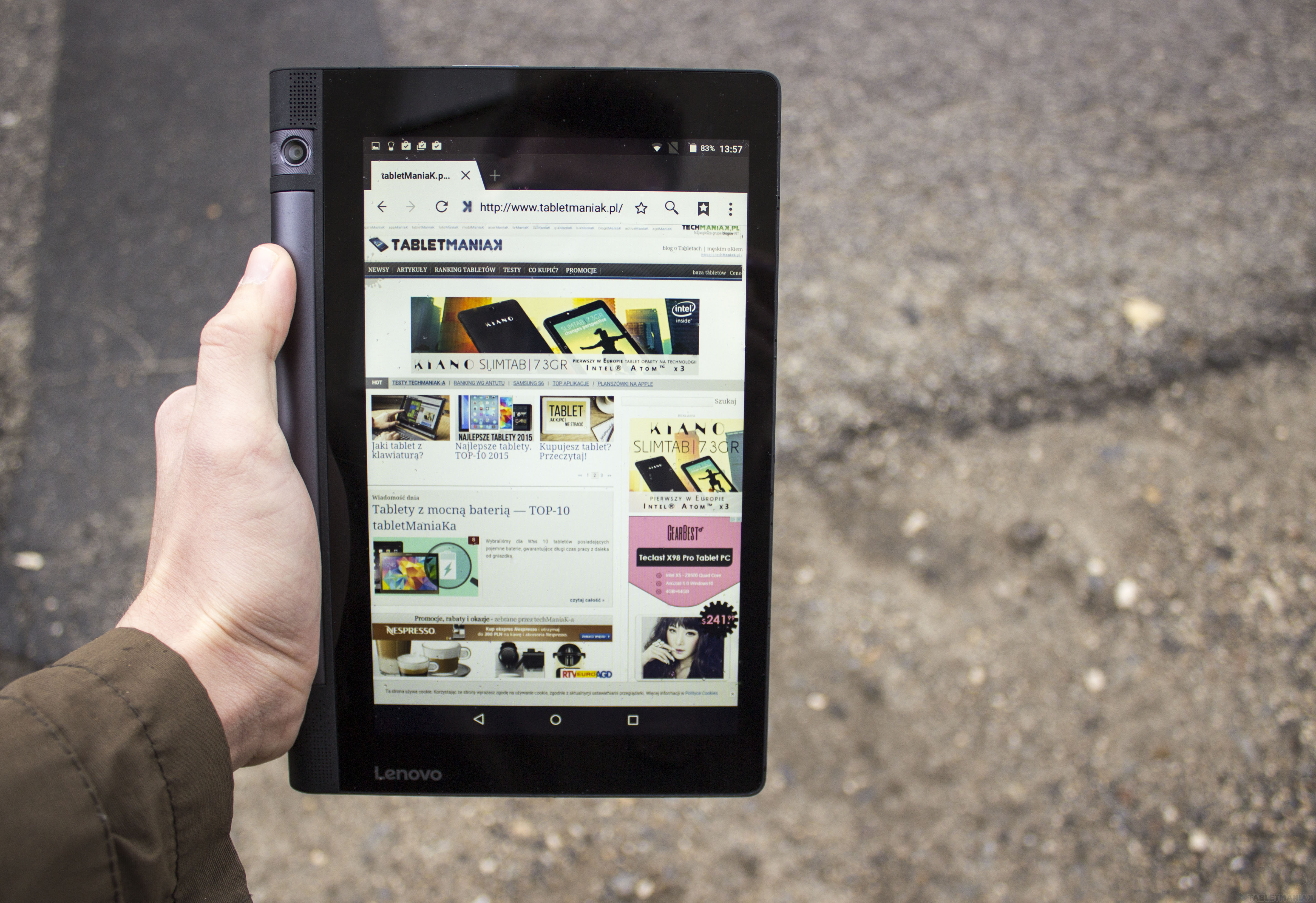 Choć w ofercie Lenovo nie brakuje fajnych modeli z ekranem o przekątnej 7 cali, to cieszy mnie fakt, że Lenovo Yoga Tab 3 otrzymał 8-calowy wyświetlacz. Nie jest duży, dlatego nie ujmuje niczego z mobilności tabletu, a jednocześnie wydaje mi się lepszy w obsłudze. Mamy wystarczająco dużo miejsca, aby wygodnie przeglądać strony internetowe w widoku komputerowym czy oglądać filmy i zdjęcia.