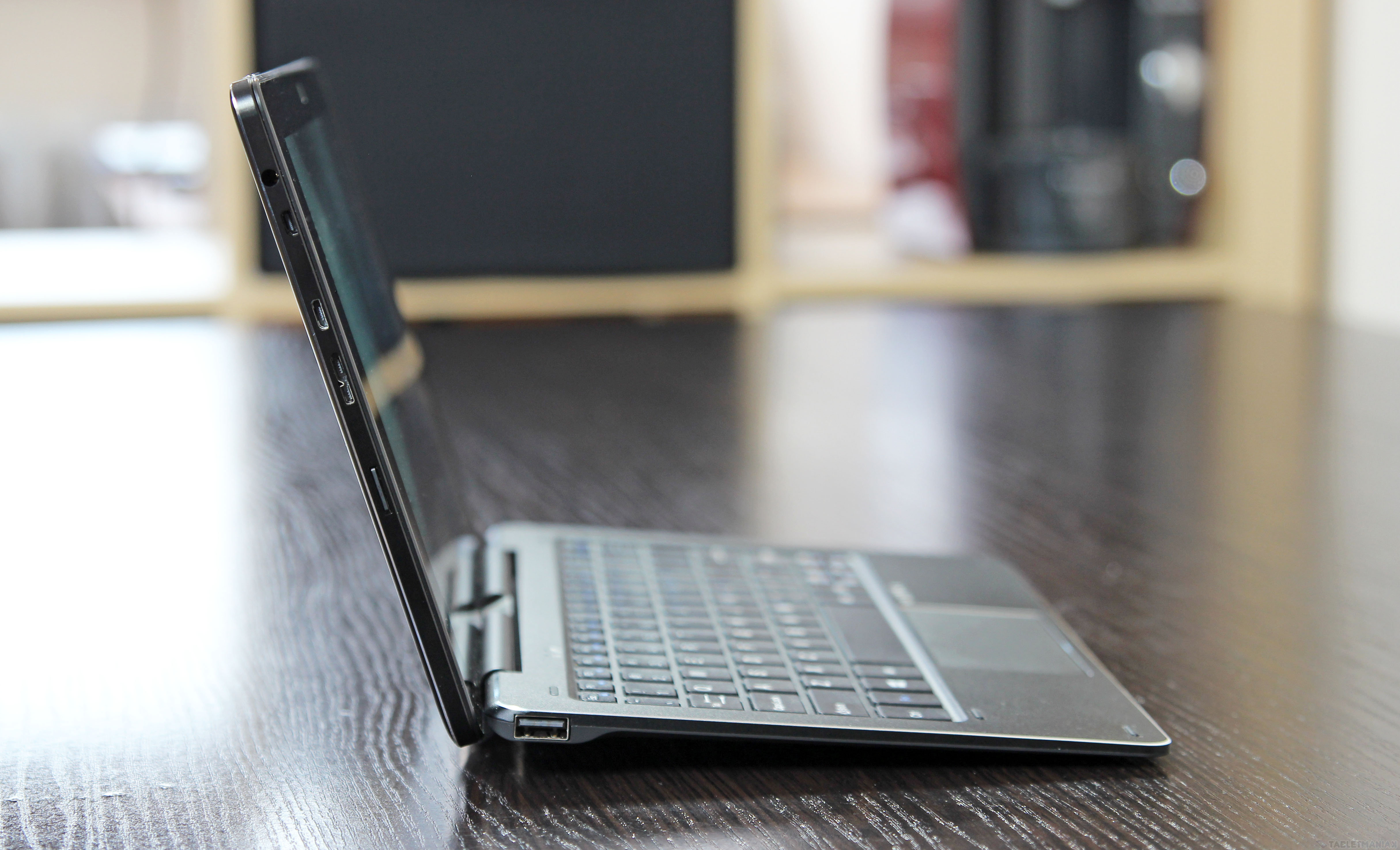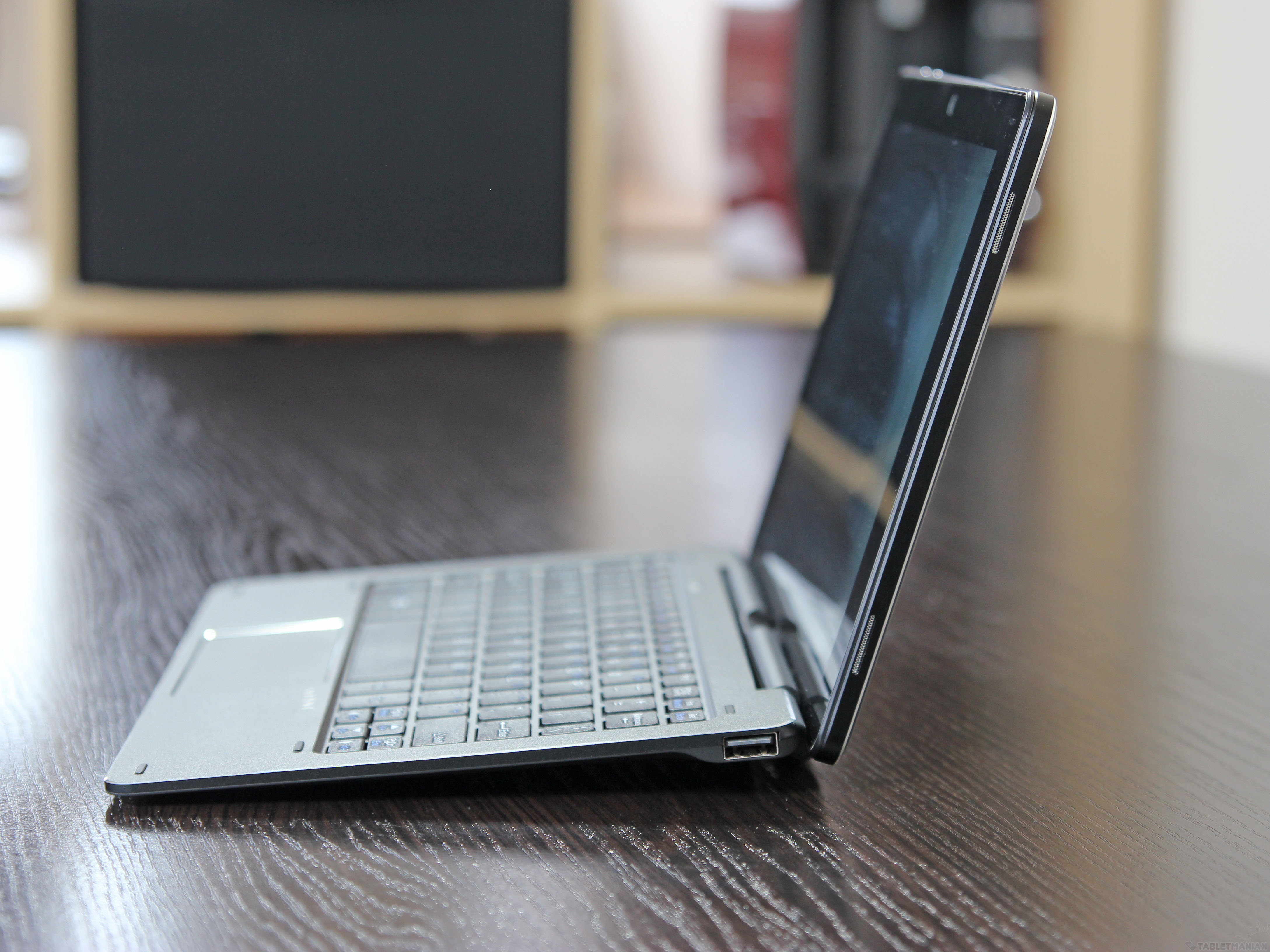 Mechanizm łączący ze sobą oba elementy opiera się na wykorzystaniu zaczepów i jest bardzo solidny – niestety, nie pozwala na szeroką regulację kąta odchylenia ekranu. W normalnych warunkach, kiedy urządzenie spoczywało na blacie biurka, nie narzekałem na komfort pisania – zdecydowanie gorzej pracowało mi się natomiast w drodze, choćby jadąc autobusem, z tabletem opartym na kolanach czy plecaku.