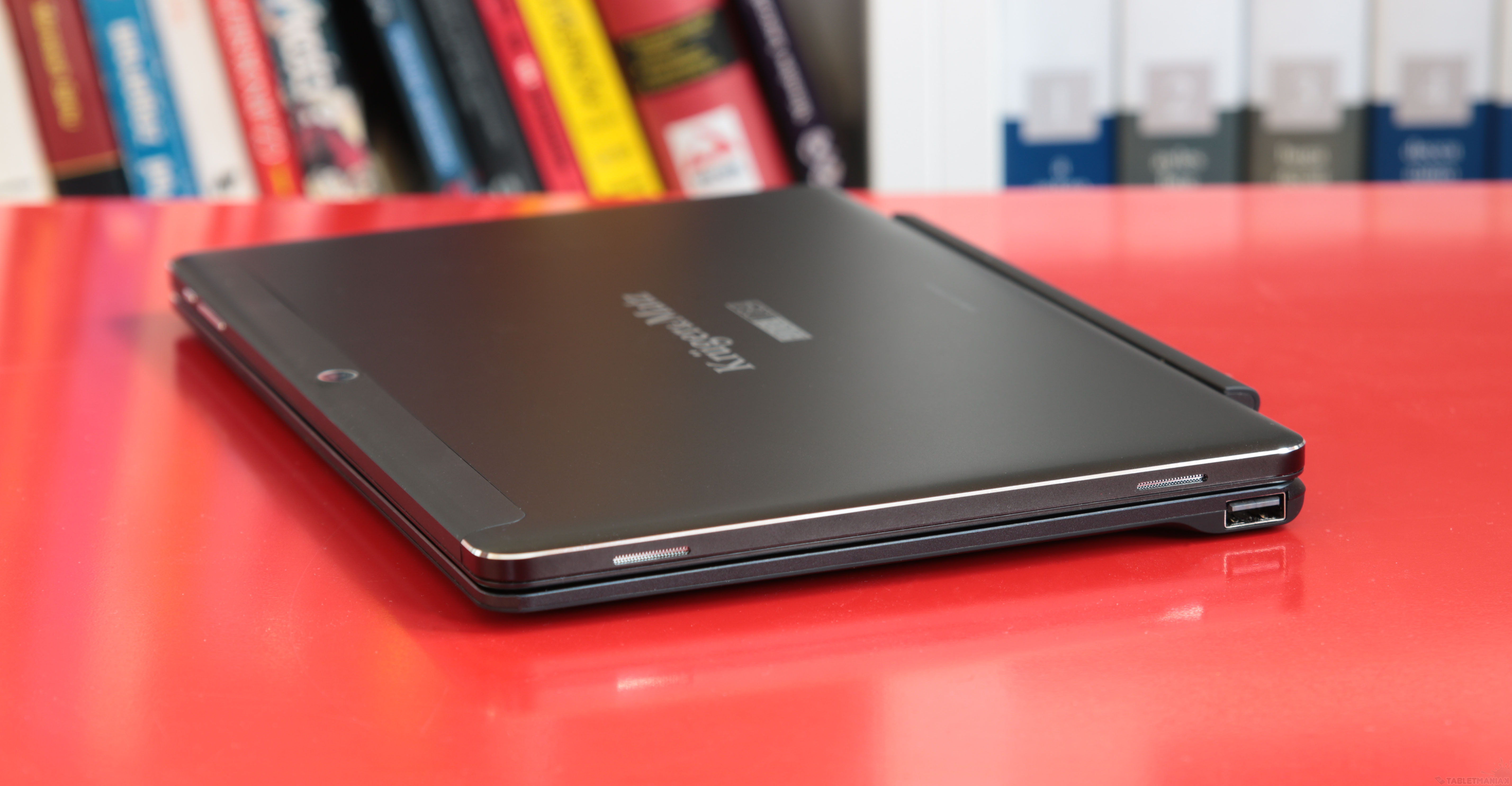 Stylistycznie stonowana bryła tabletu została wyposażona w sporą ilość portów i gniazd rozszerzeń. Większość z nich — dwa porty microUSB (2.0 i 3.0 z pełną obsługą OTG), wyjście micro-HDMI, złącze audio oraz sloty na kartę micro-SIM oraz microSD znajdziemy na lewym boku tabletu. Po prawej stronie znajdują się natomiast dwa głośniki. Na górnym boku znajdziemy jeszcze guziki fizyczne, a na dolnym element mocujący z podstawką.
