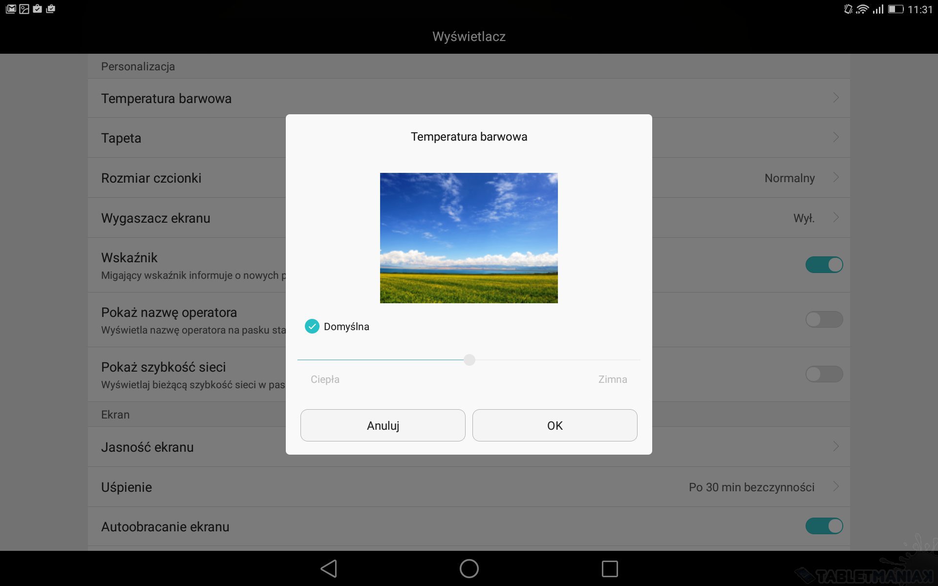W ustawieniach systemowych możemy zmienić sobie jeden ważny paramter, a mianowicie moduł zmieniający temperaturę barwową. Dzięki temu, kiedy będziemy korzystać z tabletu po zmroku możemy ocieplić obraz. Z takim trendem spotykamy się co raz częściej wśród urządzeń mobilnych – fajnie, że producent także i tu daje taką możliwość. Cieplejszy obraz to mniej niebieskiego światła i zdecydowanie przyjemniejsze korzystanie z tabletu po zmroku.