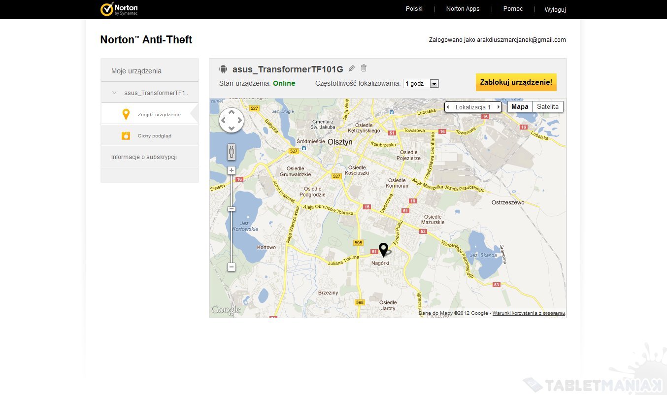Ta usługa zasługuje na osobny punkt. Należy ją ściągnąć i zainstalować w postaci pluginu. Raz uruchomiona działa w tle. Nie posiada interfejsu, a operujemy nią zdalnie np. z poziomu komputera, logując się na stronie producenta na wcześniej utworzone konto (wymagana rejestracja urządzenia w systemie Norton Anti-Theft). Oferuje możliwość zablokowania urządzenia mobilnego, zlokalizowania urządzenia oraz do zdalnego wykonania zdjęcia za pomocą kamery w tablecie lub smartfonie.