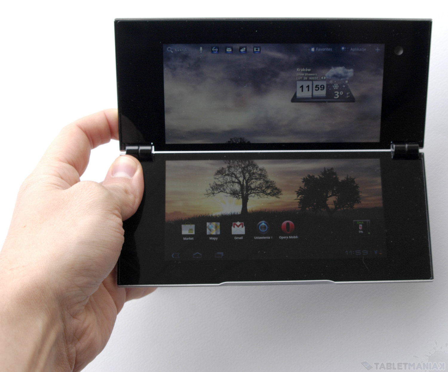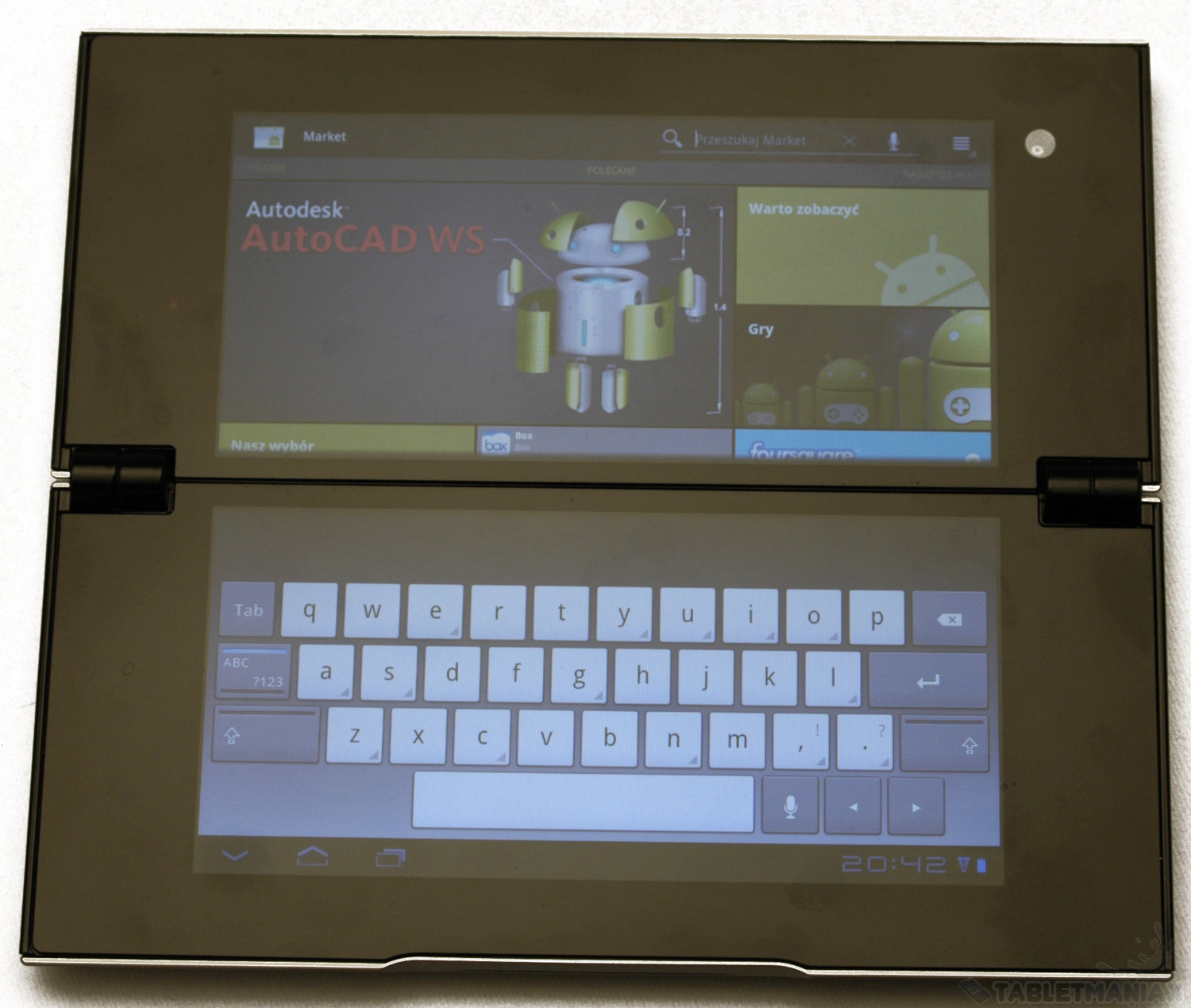 Do wyboru mamy dwa tryby pracy. W pierwszym, wyświetlacze pracują jak jeden ekran, a efekt końcowy zbliżony jest do tego, który znamy ze standardowych tabletów (pomijając oczywiście drobną przeszkodę, w postaci blisko centymetrowej przerwy w połowie obrazu). W drugim, każdy z wyświetlaczy pracuje do pewnego stopnia niezależnie, prezentując różne obrazy. Niestety – w ten sposób można jedynie wyświetlić powiązane ze sobą elementy interfejsu (np klawiaturę i ekran wprowadzania tekstu), a nigdy dwóch różnych, jednocześnie uruchomionych aplikacji. Sytuację komplikuje dodatkowo fakt, iż w niektórych wypadkach nie mamy możliwości wyboru trybu pracy i skazani jesteśmy na ustawienia systemowe danej aplikacji lub panelu.