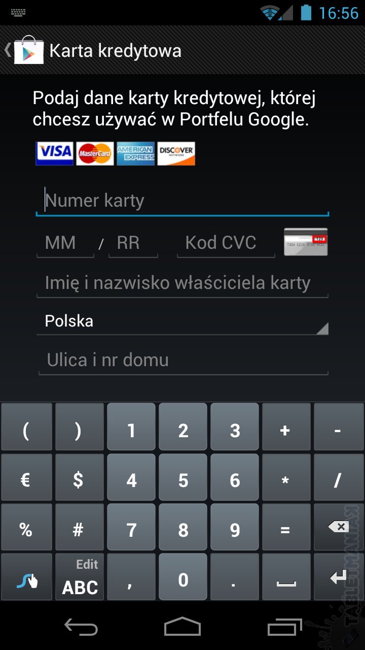 Wchodzimy na tą stronę. W lewym menu klikamy na nowa karta i rozpoczyna się ostatni etap rejestracji: podajemy numer karty (warto wzmiankować, że to ten krótszy numer), który możecie zobaczyć w edycji swojego konta, składa się on zazwyczaj z 16 cyfr. Nie mylcie go z rachunkiem karty, w skład którego wchodzi owych cyfr 26. Podajemy datę wygaśnięcia karty (zwykle karta wydawana jest na dwa lata, jednak te informacje także znajdziecie w zakładce kart w Waszym koncie bankowym), do tego trzycyfrowy kod CVV2 o którym pisałem wyżej, na końcu swoje dane adresowe i…gotowe 🙂 Zapisujecie dane, wylogowujecie się i po chwili możecie już kupować aplikacje z poziomu Google Play. Życzymy owocnych, niezbyt drogich zakupów. 🙂