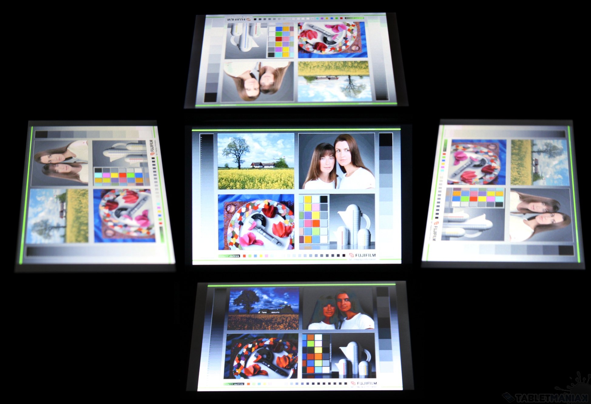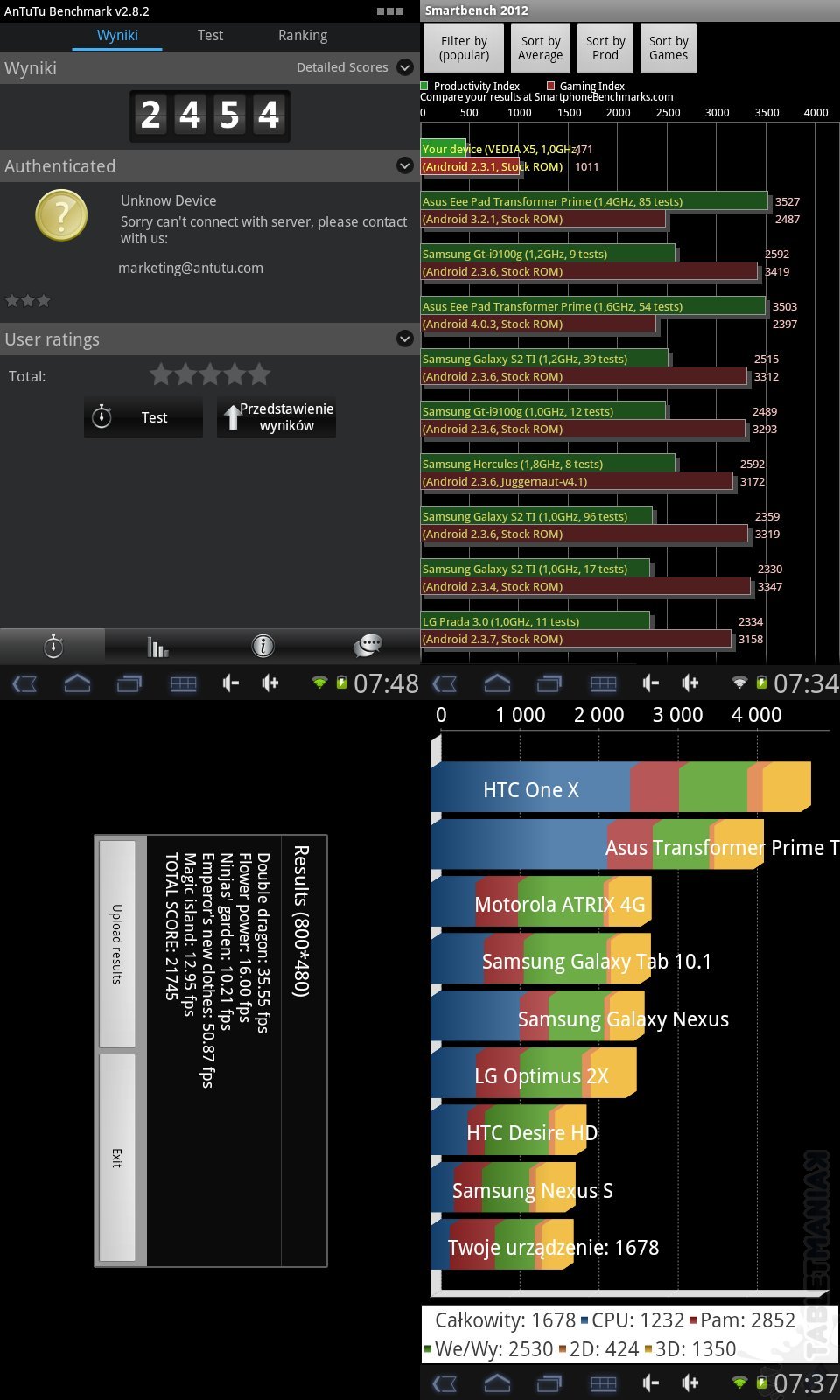 Zerknijmy teraz na zestawienie wartości liczbowych. Przeprowadziliśmy cztery popularne benchmarki – zaczynając od lewego, górnego rogu, mamy wyniki dla AnTutu (2454 pkt.), Smartbench 2012 (471/1011 pkt.), An3DbenchXL (21745 pkt.) i Quadrant (1678 pkt.).