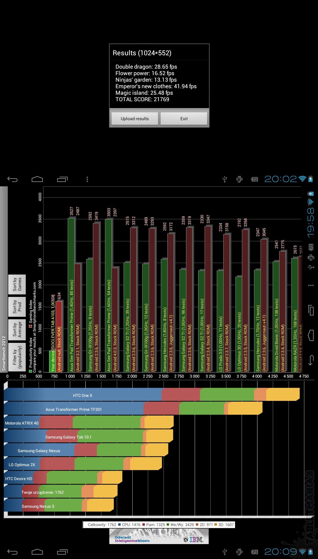 Przeprowadziliśmy trzy popularne benchmarki – zaczynając od góry, mamy wyniki dla An3DbenchXL (21769 pkt.), Smartbench 2012 (508/1634 pkt.) i Quadrant (1762 pkt.). Chociaż sprzęt nie dorównuje wydajnością takim urządzeniom jak Transformery, to jednak daje obietnicę uruchomienia bardziej zaawansowanych pozycji z Google Play. Jak jest w praktyce?