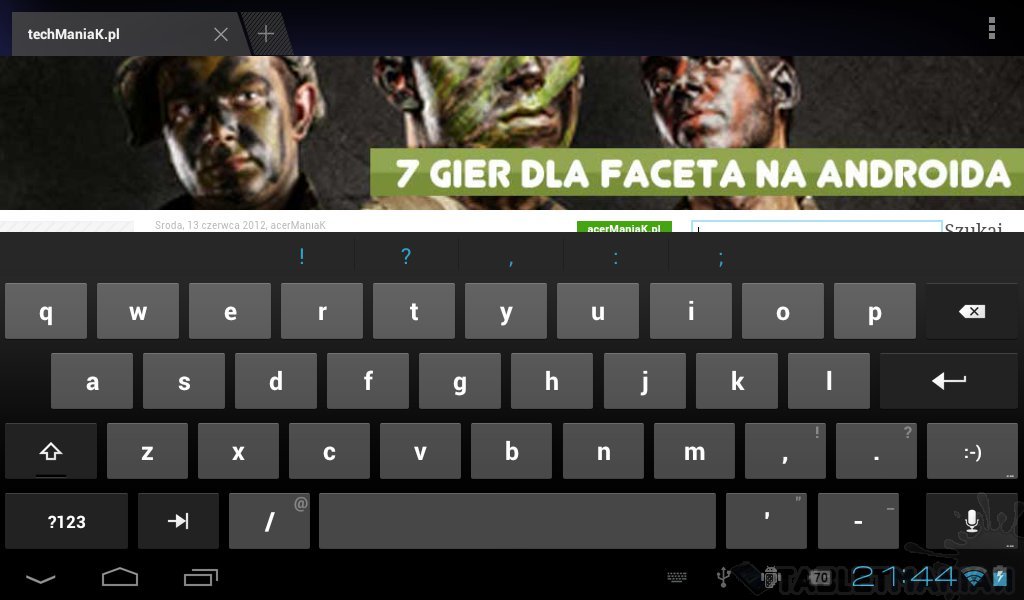 Klawiatura ekranowa składa się z czterech rzędów przycisków. Jest bardzo wygodna przy układzie pionowym. Klawisze są ułożone wyspowo, dzięki czemu nie klikniemy przez przypadek niepożądanego przycisku. W układzie horyzontalnym jednak, tablet wydaje się być zbyt szeroki. Klawisze są rozmieszczone na całej szerokości ekranu, przez co ciężko się obsługuje te umieszczone na środku. O wiele lepszym rozwiązaniem byłoby podzielenie klawiatury i rozsunięcie jej na boki.