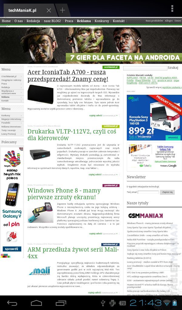 Bez większego problemu pobraliśmy z sieci kilka ciekawych tytułów, takich jak Shadowgun, Dungeon Defender oraz Blood and Glory. Niestety tylko ostatnią z wymienionych udało nam się uruchomić. W pozostałych przypadkach tablet albo odmawiał posłuszeństwa całkowicie wyłączając aplikację, albo nie współpracował już na poziomie menu głównego. To trochę ostudziło nasz pierwotny zapał i zachwyt mocną specyfikacją techniczną. Raz jeszcze jednak uczulamy, aby potencjalni użytkownicy pamiętali, że jest to sprzęt niskobudżetowy i jako taki sprawdził się całkiem dobrze.