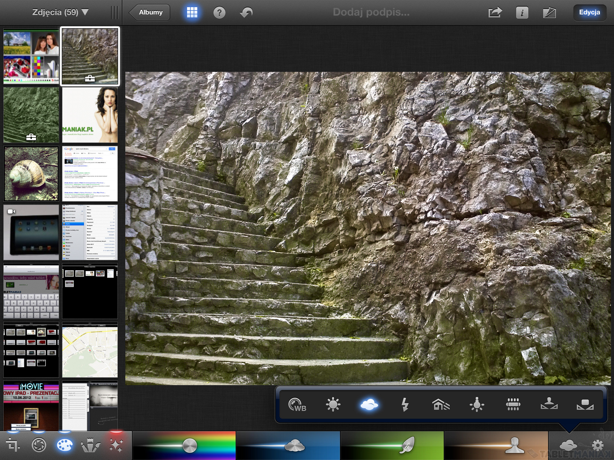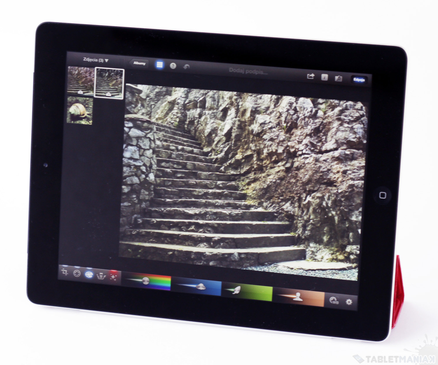 Następnym krokiem był wybór dobrego narzędzia do obrabiania zdjęć. Nie, nie tych robionych tabletem, bo fotografowanie za pomocą iPad’a (tak jak i każdego innego 10-calowego sprzętu) uważam za poważne nieporozumienie. Szukając sensownej aplikacji, która poradziłaby sobie z szybką i wydajną obróbką fotografii importowanych z lustrzanki czy kompaktu, przejrzałem kilka różnych programów. Najbardziej do gustu przypadła mi mobilna wersja słynnego edytora grafiki – Adobe Photoshop Touch (koszt 7,99 EUR) – oraz tańsza i zdecydowanie prostsza w obsłudze (choć mniej funkcjonalna) aplikacja iPhoto (koszt 3,99 EUR) będąca częścią pakietu iLife. I to właśnie tą ostatnią poleciłbym wszystkim amatorom, którzy chcą szybko i sprawnie edytować i udostępniać zdjęcia. Intuicyjna obsługa, bogaty zestaw narzędzi do dyspozycji i przede wszystkim naprawdę świetnie zaprojektowany interfejs pod ekran dotykowy. Nic dodać, nic ująć. 😉