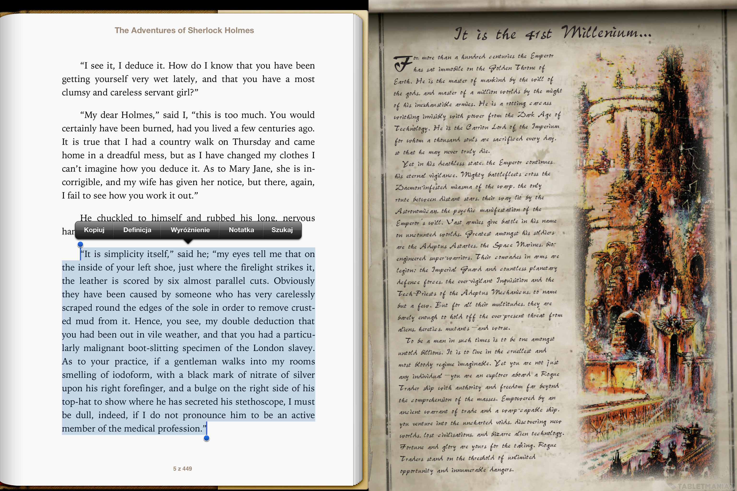 Do czytania elektronicznych książek posłuży nam iBooks, który nie jest co prawda dostępny od samego początku, ale instaluje się jak tylko wyrazimy na to zgodę, wkrótce po pierwszym uruchomieniu tabletu. Program jest funkcjonalny, prosty i czytelny. Nie radzę jednak z jego pomocą walczyć z czymś więcej, jak tylko prostymi (w sensie układu) książkami. Bardziej skomplikowane dokumenty (np wielowarstwowe .PDF z dodatkiem ciężkiej grafiki) to już zadanie dla innej aplikacji. Ja postawiłem na darmowego Adobe Reader, który od iBooks różni się jak niebo od ziemi. Oczywiście nie ma go w pakiecie startowym, ale z racji tego że jest bezpłatny, dostęp do niego nie stanowi problemu.