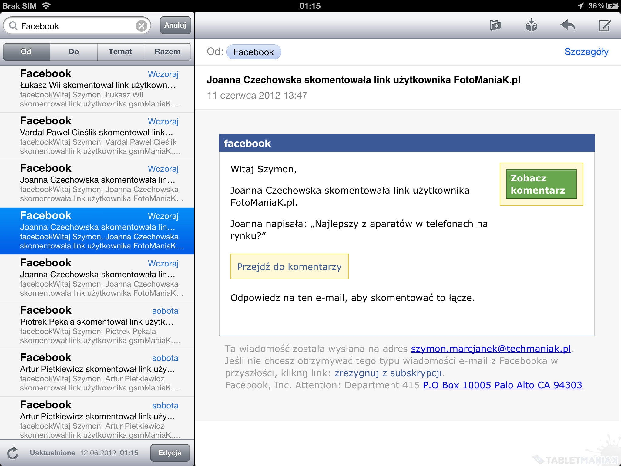 Klient poczty e-mail jest przejrzysty i łatwy w użytkowaniu, bez trudu również skonfigurujemy go pod kątem popularnych kont pocztowych. Jeśli dodamy do tego świetnie zaprojektowany interfejs, płynnie dostosowujący się do orientacji tabletu, oraz wsparcie dla popularnych formatów plików (bezpośrednio w aplikacji odczytać można między innymi jpg, tiff, gif, doc, docx czy pdf, by wymienić tylko niektóre) otrzymamy świetne narzędzie – niestety tylko dla osób mniej wymagających. Niemożność wykonania tak podstawowych operacji jak szybkie dodanie załącznika ze zdjęciem (trzeba to zrobić na około, przez program Galeria) czy zaawansowana konfiguracja konta pocztowego, przekreśli wbudowanego klienta w oczach wielu osób.