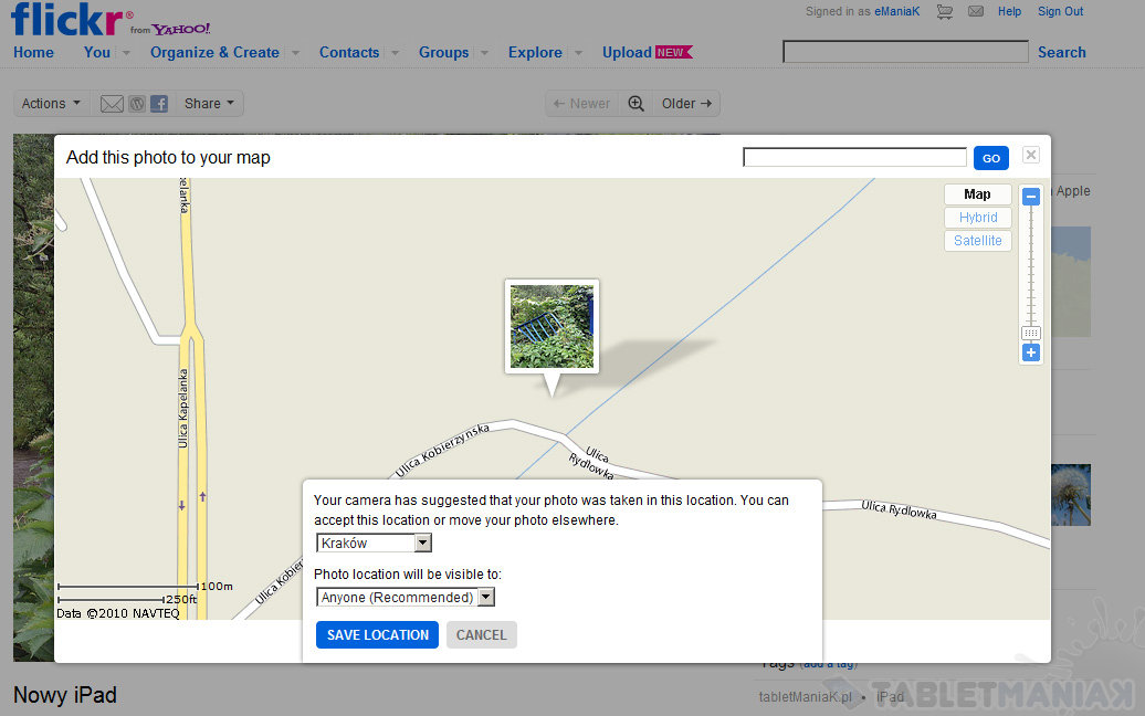 Wersja iPad’a z 4G (choć w zasadzie wypadałoby napisać 3G) może również korzystać z dobrodziejstw modułu GPS, który w połączeniu z mapami ma teoretycznie zamienić tablet w nawigację oraz umożliwić geotagowanie zdjęć. Pierwszej opcji nie miałem okazji wypróbować w praktyce, w wypadku drugiej precyzja dodanych znaczników była więcej, niż wystarczająca. Lokalizacja przykładowego zdjęcia poniżej została bez trudu właściwie przyporządkowana w serwisie Flickr.