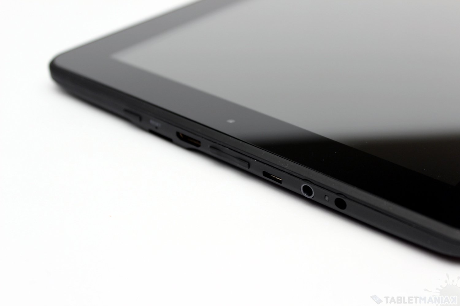 Projektanci umieścili wszystkie porty komunikacyjne na jednej, bocznej ściance tabletu. Nie ma ich jednak przesadnie dużo. Użytkownik ma dostęp do klasycznego zestawu, na który składa się port micro-USB, mini-HDMI, slot kart SDHC, gniazdo jack 3,5 mm oraz oczywiście złącze dedykowane zasilaczowi sieciowemu. Dla osób, które nie obędą się bez pełnowymiarowego portu USB, producent dorzucił do zestawu specjalną przejściówkę. Dzięki niej bez większych problemów podłączymy zarówno dyski zewnętrzne, pamięci przenośne, jak i modemy 3G. Ostatnią z możliwości przetestowaliśmy na modemie Huawei E173 i karcie Play.