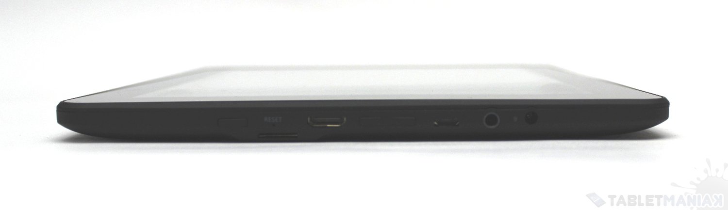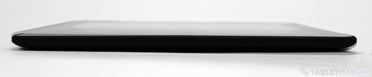 Brak wykształconej ramki okalającej ekran będzie odczuwalny przy dłuższym korzystaniu z tabletu. Opieranie kciuków bezpośrednio na tafli ochronnej wygeneruje dużo tłustych odcisków palców. Esteci nie obędą się bez odpowiedniej szmatki do czyszczenia. Głośnik został umieszczony z tyłu, ale w miejscu, które raczej nie zasłonimy dłońmi, niezależnie od tego czy pracujemy akurat w układzie horyzontalnym, czy pionowym. Interfejs oraz wszystkie porty zostały skupione na bocznej ściance.