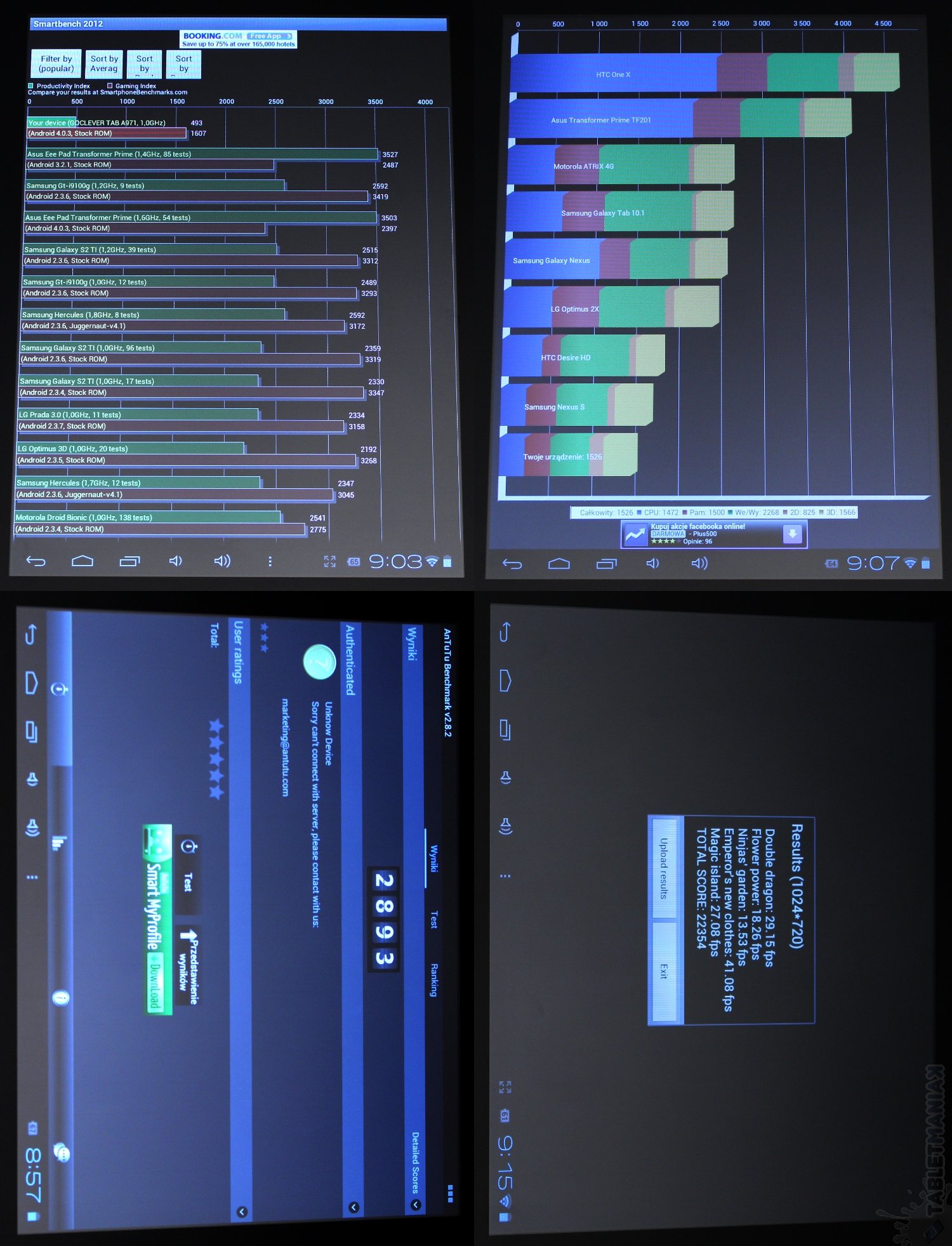 Przeprowadziliśmy cztery popularne benchmarki – zaczynając od góry, mamy wyniki dla Smartbench 2012 (493/1607 pkt.), Quadrant (1526 pkt.), AnTutu (2893 pkt.) i An3DbenchXL (22354 pkt.). Oczywiście sprzęt nie dorównuje klasie Transformerów – jest raczej porównywalny do modelu A103 tego samego producenta.