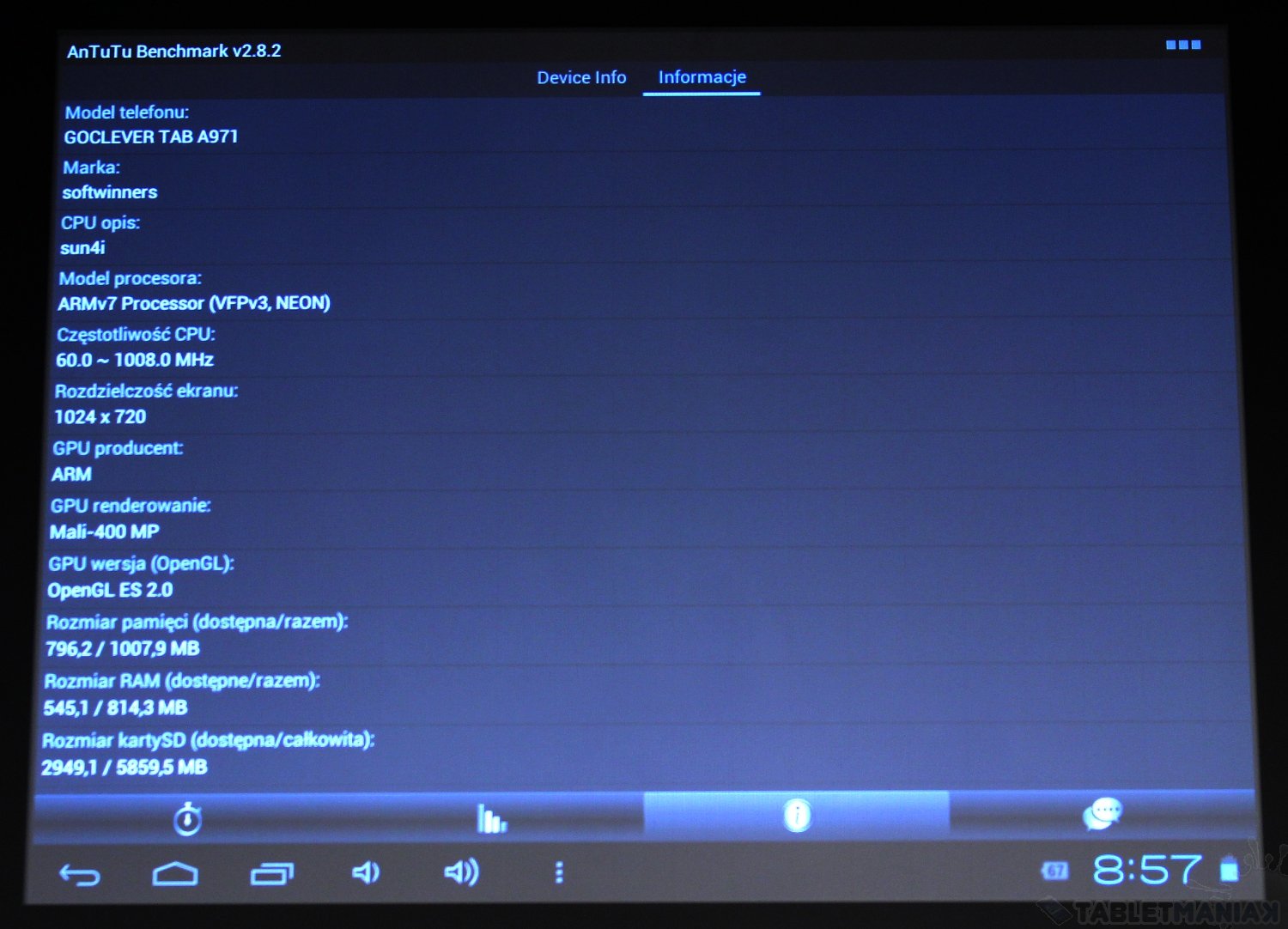 Tablet zbudowany jest w oparciu o procesor Allwinner A10 oparty na architekturze Cortex A8, o taktowaniu 1 GHz. Jednostka obliczeniowa współpracuje z układem graficznym Mali-400 MP i 1 gigabajtem pamięci RAM. To dwukrotne więcej niż w konkurencyjnych urządzeniach, ale wciąż warto zaopatrzyć się w aplikację trwale wyłączającą procesy. Jako magazyn danych wykorzystać możemy 8 GB pamięci użytkowej. Oczywiście część z tego jest zajęta przez zainstalowane aplikacje oraz wymagający system operacyjny Android 4.0 (Ice Cream Sandwich).