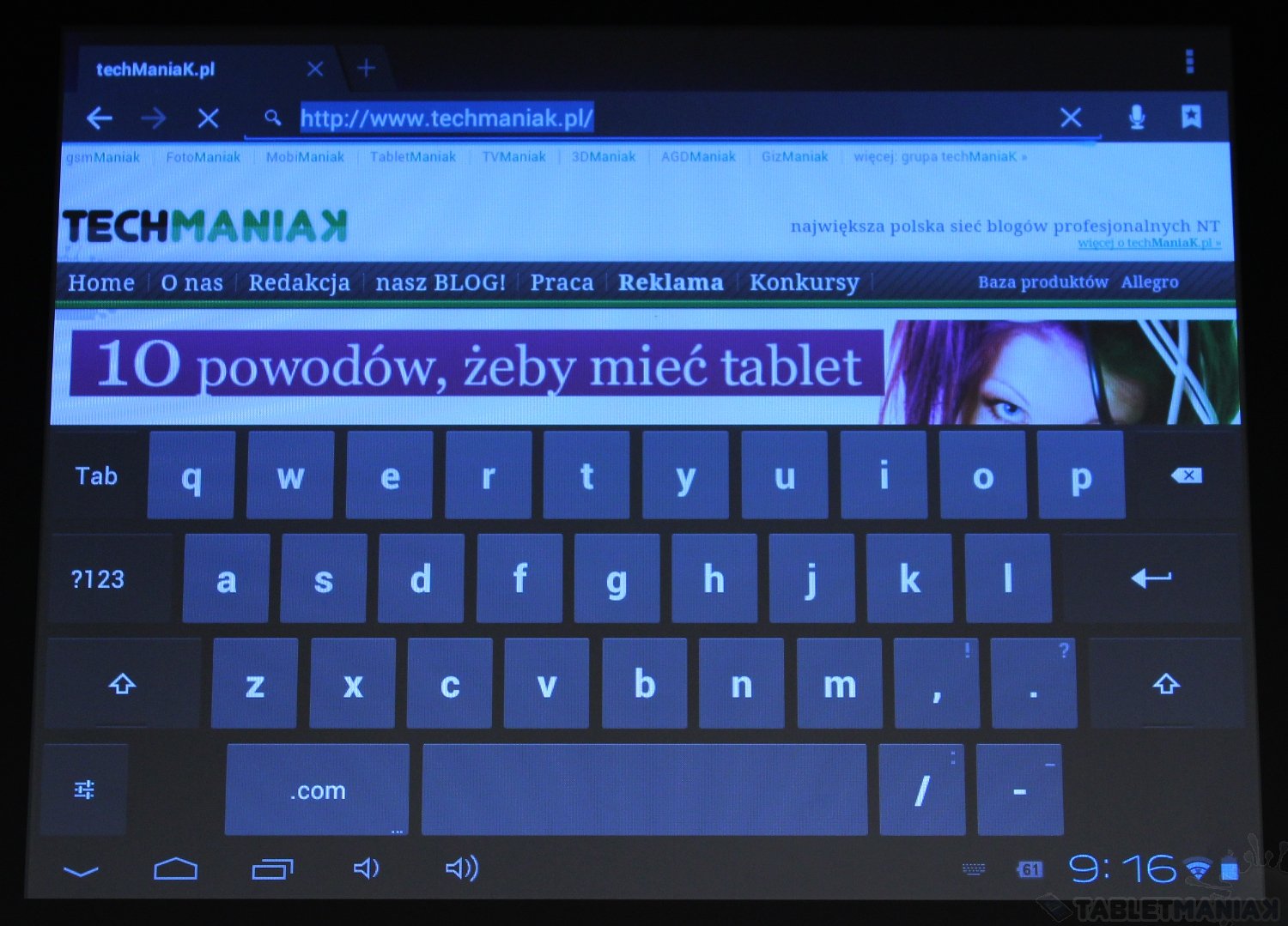 Klawiatura ekranowa składa się z czterech rzędów przycisków. Jest bardzo wygodna przy układzie pionowym. Klawisze są ułożone wyspowo, dzięki czemu nie klikniemy przez przypadek niepożądanego przycisku. W układzie horyzontalnym jednak, tablet wydaje się być zbyt szeroki. Klawisze są rozmieszczone na całej szerokości ekranu, przez co ciężko się obsługuje te umieszczone na środku. O wiele lepszym rozwiązaniem byłoby podzielenie klawiatury i rozsunięcie jej na boki.