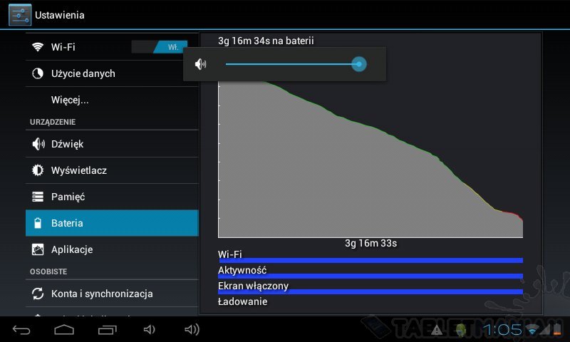 Na pokładzie urządzenia znajdziemy litowo-jonowy akumulator o pojemności 3200 mAh. Choć producent nie podaje żywotności akumulatora, nasze testy szybko zweryfikowały, że przy maksymalnym obciążeniu, tablet odmówił współpracy po nieco ponad trzech godzinach, co raczej jest standardowym czasem dla tego segmentu urządzeń. Oczywiście w zależności od intensywności użytkowania urządzenia czas ten stosunkowo się zwiększa, co prezentują poniższe wyniki.
