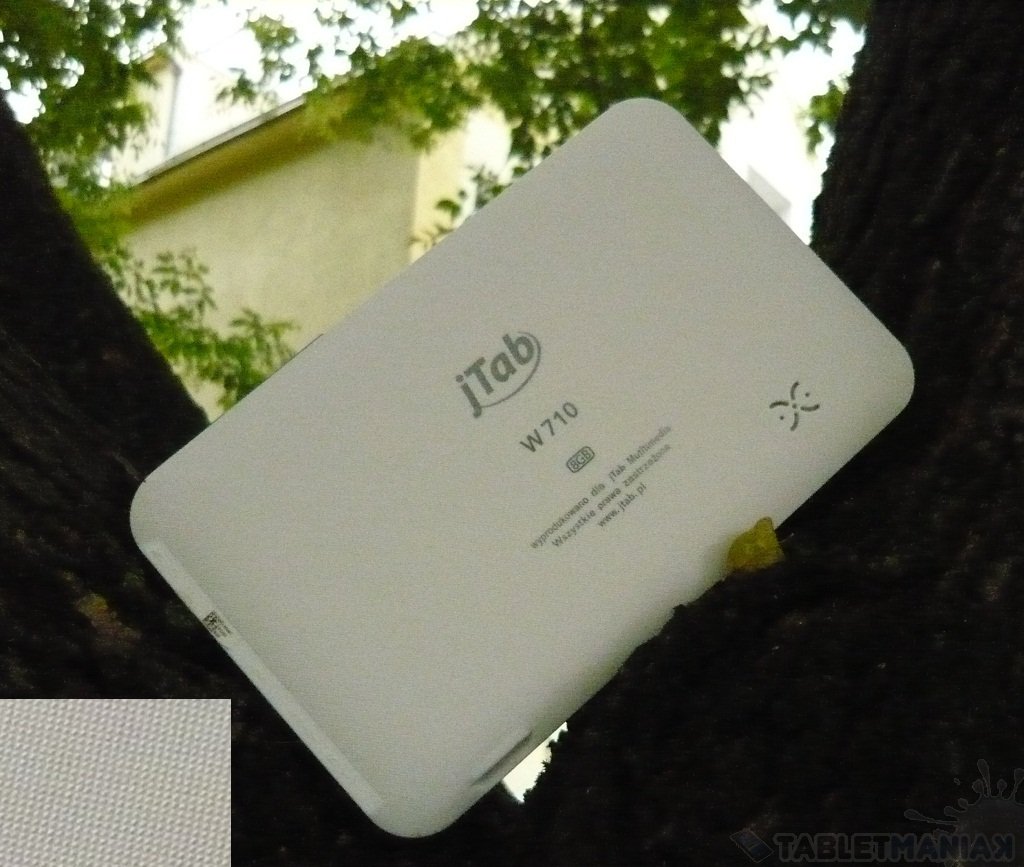 jTAB W710 to niskobudżetowe urządzenie, o czym przekonamy się już na samym początku, zaraz po wyjęciu tabletu z pudełka. Materiały, z jakich sprzęt został wykonany nie są najwyższej jakości, chociaż trzeba przyznać, że tylny panel jest dość oryginalny, a to ze względu na swoją chropowatą fakturę z matowym wykończeniem w kolorze białym, gdzie w centralnym punkcie znajdziemy laserowo grawerowane logo producenta. Zanim przejdziemy do frontowej części nie mogę pominąć faktu, iż przez tylny panel przebija podświetlenie ekranu. Na froncie znajdziemy 7-calowy wyświetlacz w proporcjach 16:9, który pokryty został taflą ochronną plastiku, która niestety w testowanym modelu nie była idealnie spasowana, co objawiało się ugięciem nawet podczas lekkiego nacisku.