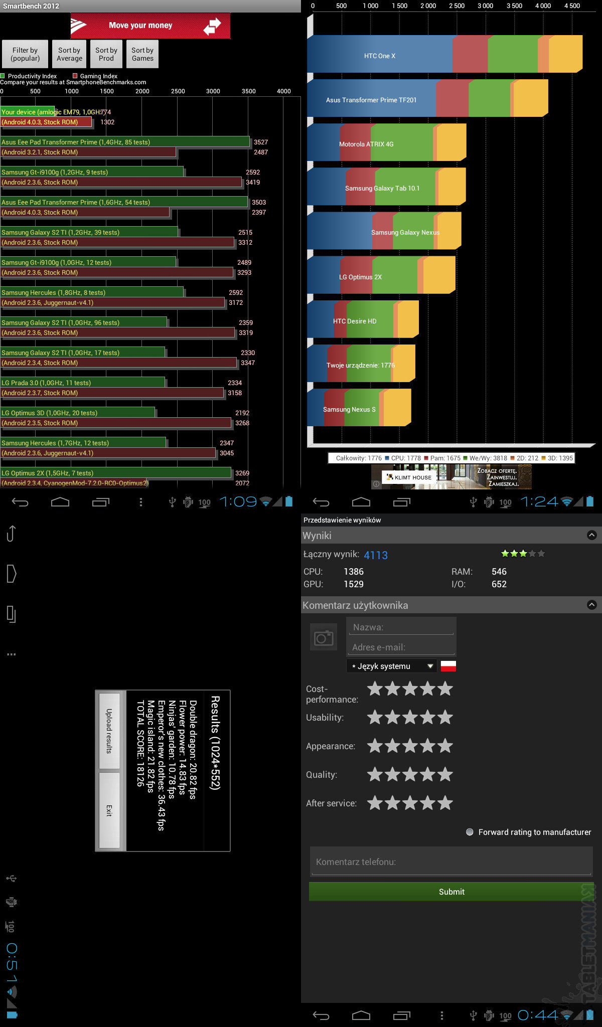Nasze praktyczne odczucia porównaliśmy z wynikami benchmarków. Przeprowadziliśmy cztery popularne testy – zaczynając od góry, mamy wyniki dla Smartbench 2012 (774/1302 pkt.), Quadrant (1776 pkt.), An3DbenchXL (18126 pkt.) i AnTutu (4113 pkt.).