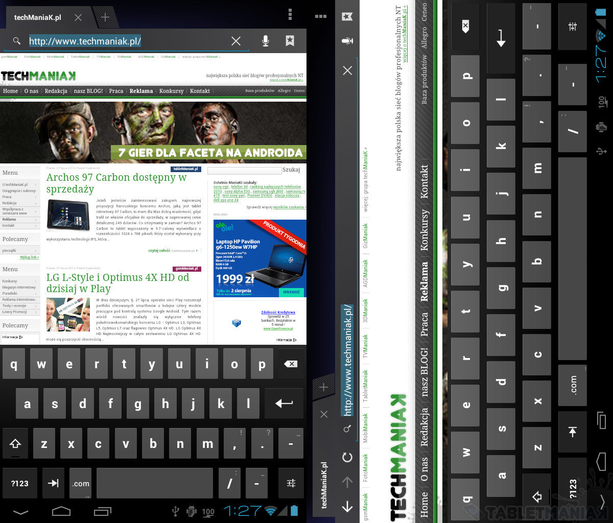 Tablet obsługuje funkcję multidotyku. Rozmieszczone pod matrycą czujniki rozpoznają jednocześnie do pięciu punktów nacisku, co umożliwia nawigację za pomocą gestów. Warto przy tym zauważyć, przy korzystaniu z urządzenia nie zarejestrowałem efektu „jacuzzi”. Dopiero bardzo silny nacisk wygeneruje siatkę drobnych kropel i nieregularności pod panelem.