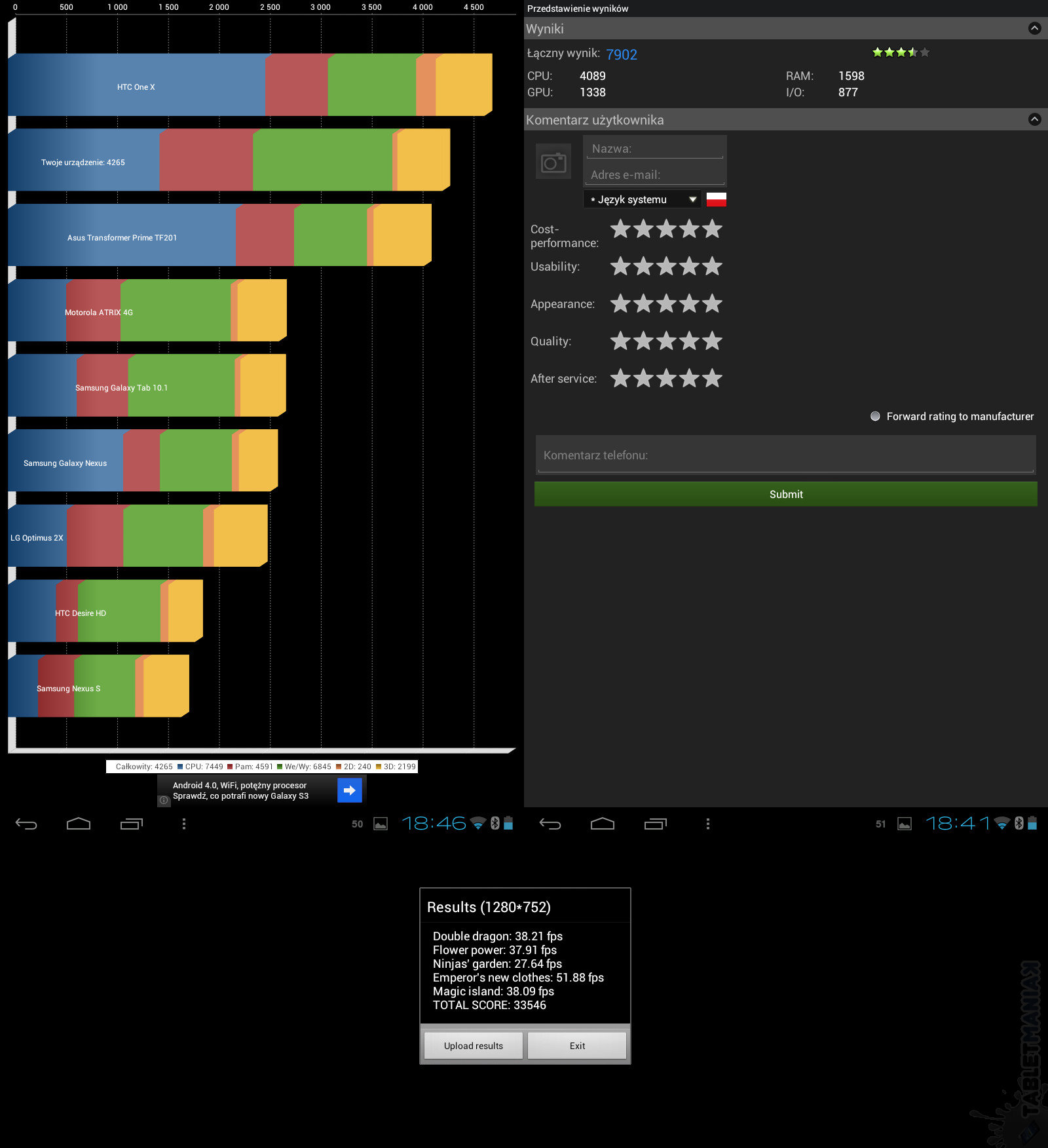 Już na pierwszy rzut oka widać, że jest to mocna konfiguracja sprzętowa. Dwurdzeniowy procesor o wysokim taktowaniu stanowi obietnicę płynnego działania aplikacji – zarówno ciężkiego i zwykle sprawiającego problemy, czytnika PDF, jak i zaawansowanych graficznie pozycji z Google Play. Shoguna przetestowaliśmy na Dead Triger, Shadowgun i Blood and Glory. W chwili pisania recenzji, mogę z czystym sumieniem napisać, że nie zawiodem się. Wszystko oczywiście potwierdzają cyfry – przeprowadziliśmy trzy popularne benchmarki. Zaczynając od góry, mamy wyniki dla Quadrant (4265 pkt.), An3DbenchXL (33546 pkt.) i AnTutu (7902 pkt.).