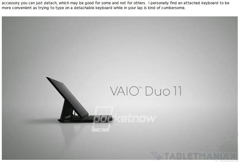 Sony VAIO DUO 11 wydaje się być urządzeniem wyposażonym w 11-calowy wyświetlacz oraz pełnowymiarową klawiaturę QWERTY, która wykorzystuje podobny mechanizm jak w tablecie ASUS Transformer Slider. Dzięki takiemu rozwiązaniu sprzętowa klawiatura jest zawsze pod ręką, a i możliwe jest korzystanie z urządzenia jak z tradycyjnego tabletu. Wyświetlacz będzie można obsługiwać zarówno za pośrednictwem dotyku jak i cyfrowego pióra. Nie jest znana specyfikacja techniczna, jednak z zaprezentowanego zdjęcia można wywnioskować, że zostanie zaimplementowany procesr firmy Intel lub AMD, co wyklucza obecność systemu Windows RT.