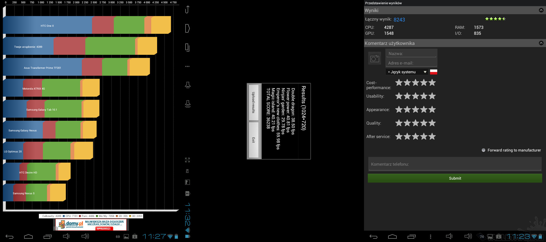 Wszystko oczywiście potwierdzają cyfry – przeprowadzilłem trzy popularne benchmarki. Zaczynając od lewej, mamy wyniki dla Quadrant (4289 pkt.), An3DbenchXL (36238 pkt.) i AnTutu (8243 pkt.). Jak widać tablet wypadł mniej więcej na poziomie popularnych propozycji Asusa!
