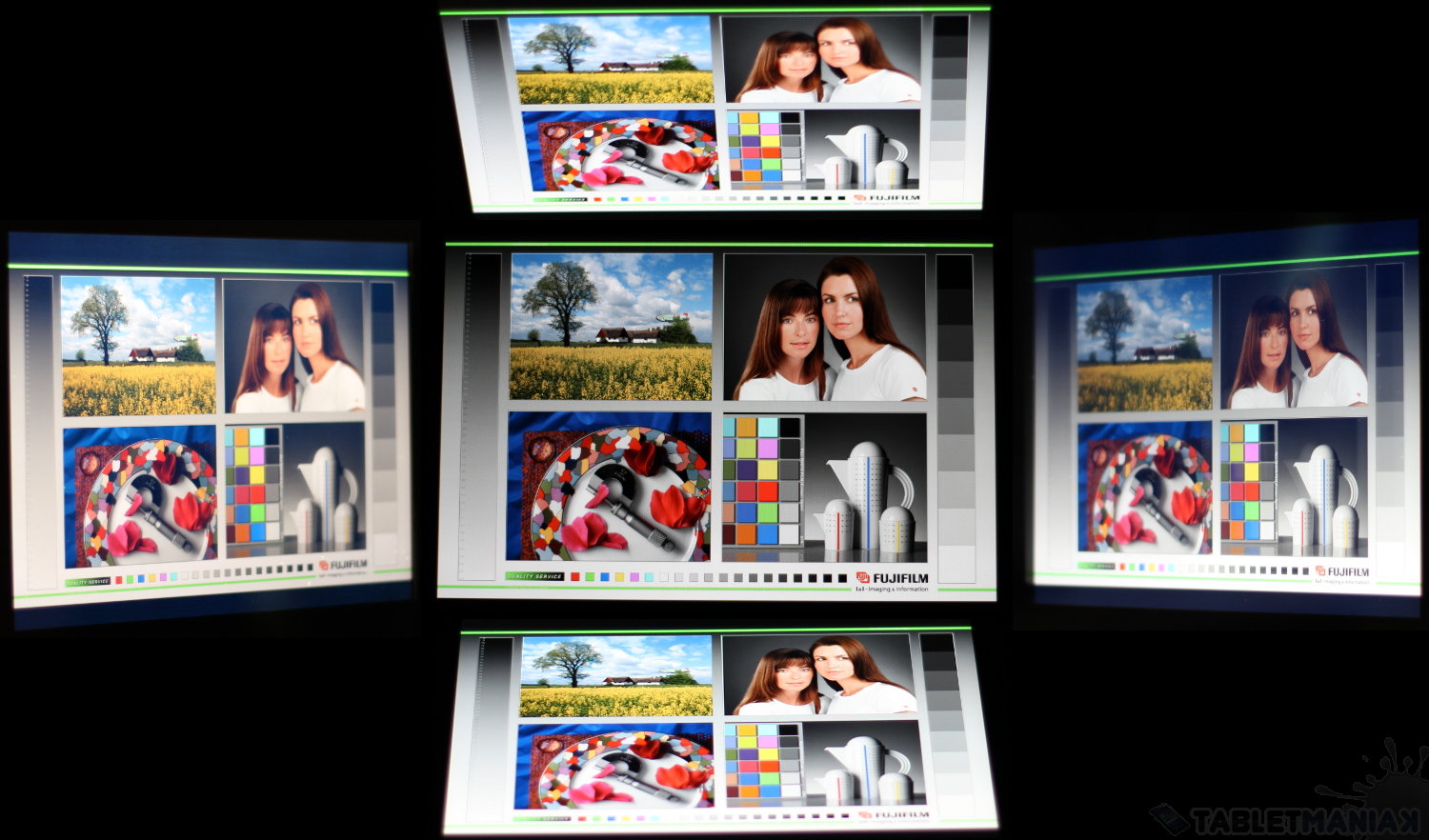 Maksymalna jasność matrycy to 333 cd/m2, przy 100-procentowej sile podświetlenia, przy czym nierównomierność podświetlenia sięga 23%. Jasność możemy zmieniać płynnie w szerokim zakresie, a najmniejsza wartość to 23 cd/m2. Na pokładzie nie znajdziemy czujnika oświetlenia. Matryca nie migoce w żadnym punkcie, nie zauważyłem również przebarwień i “martwych pikseli”.
