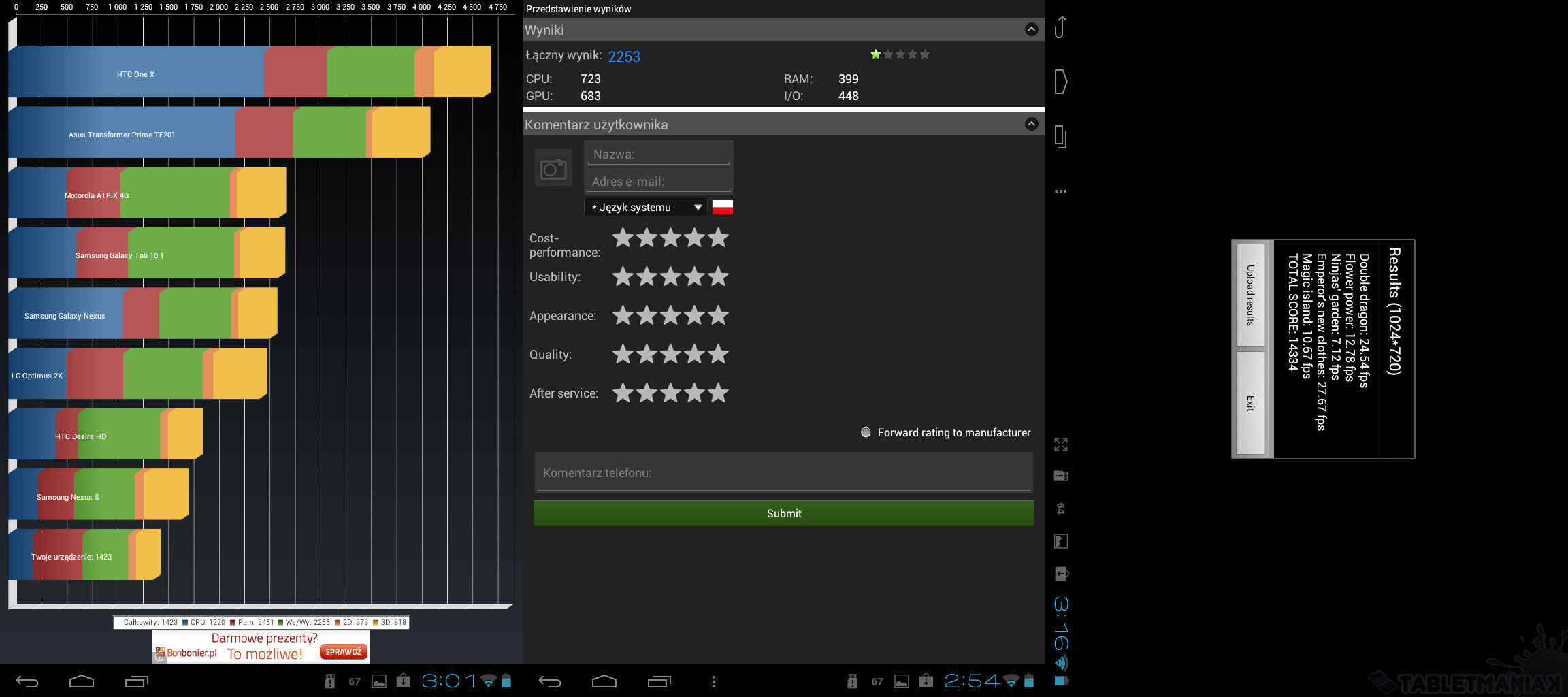 Warto zobrazować wydajność tabletu cyferkami. Przeprowadziliśmy trzy popularne benchmarki – zaczynając od lewej strony mamy wyniki dla Quadrant (1423 pkt.), AnTutu (2253 pkt.) i An3DbenchXL (14334 pkt.). Poniżej możecie zobaczyć zestawienie testowanych przez nas tabletów podobnej klasy.