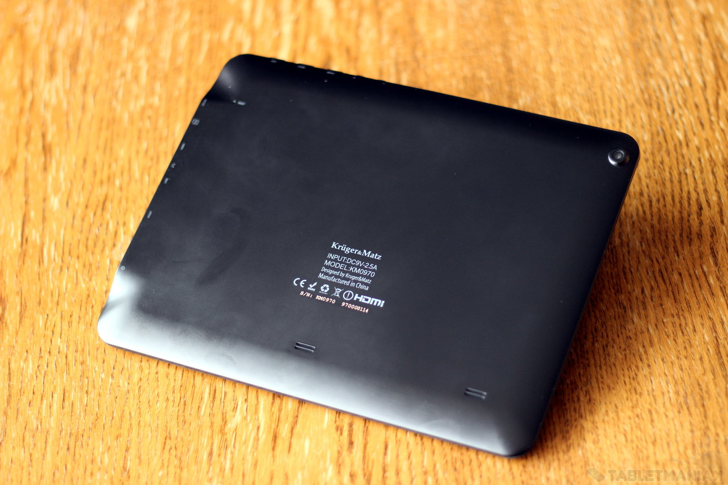 Muszę przyznać że Krüger&Matz KM0970 pozytywnie mnie zaskoczył. Biorąc to urządzenie do ręki nie przyjdzie nam do głowy, że jest to tablet za przeszło 700 złotych. Solidna konstrukcja została dobrze zaprojektowana. Wzornictwo odznacza się spartańską prostotą i elegancją półmatowych wykończeń. Proste wyokrąglenia naroży o małym promieniu dobrze się komponują z profilowanym tylnym panelem. Boczne ścianki zostały ścięte tak, aby zlewały się z frontem i spodem obudowy. Tablet wizualnie sprawia dobre wrażenie – zachęca do pracy i nie odstrasza zbędnymi i nadmiernymi ozdobami. Producent ograniczył się do umieszczenia skromnego logo i nadruku na odwrocie.
