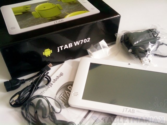 Tablet jTAB otrzymamy w małym, czarnym i niezwykle zgrabnym pudełeczku, z uśmiechniętym, zielonym robocikiem. Wnętrze opakowania, oprócz samego urządzenia jest równie pozytywne. Producent zapakował nam również ładowarkę, przejściówkę microUSB – USB 2.0 (dzieki której do tabletu możemy podłączyć zewnętrzne nośniki pamięci), kabel microUSB – USB 2.0, ściereczkę do czyszczenia ekranu, instrukcję obsługi w języku polskim, kartę gwarancyjną oraz zestaw słuchawkowy. Całkiem sensowne wyposażenie, a zwłaszcza biorąc pod uwagę, że za całość zapłacimy niespełna 520 złotych.
