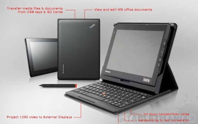 Biznesowy Lenovo ThinkPad otrzymał 10,1-calowy, pojemnościowy ekran dotykowy IPS, pokryty wytrzymałym szkłem Corning Gorilla Glass. Pracuje on z natywną rozdzielczością 1280 x 800 pikseli i wspomagany przez technologię multi-touch. Ekran ten podobnie jak w modelu IdeaPad P1 można obsługiwać zarówno palcami, jaki specjalnym rysikiem, dołączanym do zestawu z urządzeniem. Opcjonalnie tablet Lenovo ThinkPad możemy zakupić ze specjalnym pokrowcem, wyposażonym w pełnowymiarową klawiaturę QWERTY z charakterystycznym dla serii ThinkPad trackpointem.
