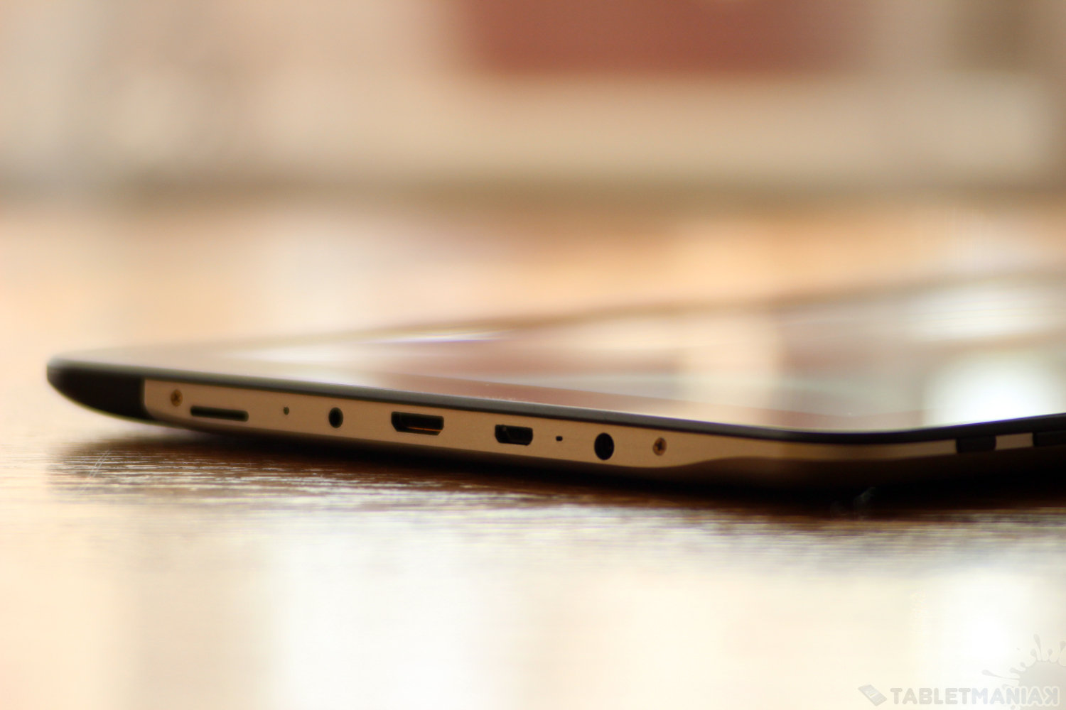 Tablet został uzbrojony w standardowy zestaw portów, na który składa się wejście zasilania, złącze mini-HDMI, audio jack 3,5 mm, slot kart microSD oraz gniazdo micro-USB. Producent oddaje przy tym w ręce użytkownika bogaty zestaw akcesoriów – kabel USB (za pośrednictwem którego podepniemy urządzenie do komputera), krótką przejściówkę na pełnowymiarowe oraz żeńskie złącze USB. Okablowanie pozwoli podłączyć do tabletu dyski zewnętrzne, pamięci przenośne, a także urządzenia wskazujące (np. myszkę). Listę kończą słuchawki „pchełki” na metrowym kablu z klipsem i przyciskiem na zgrubieniu.