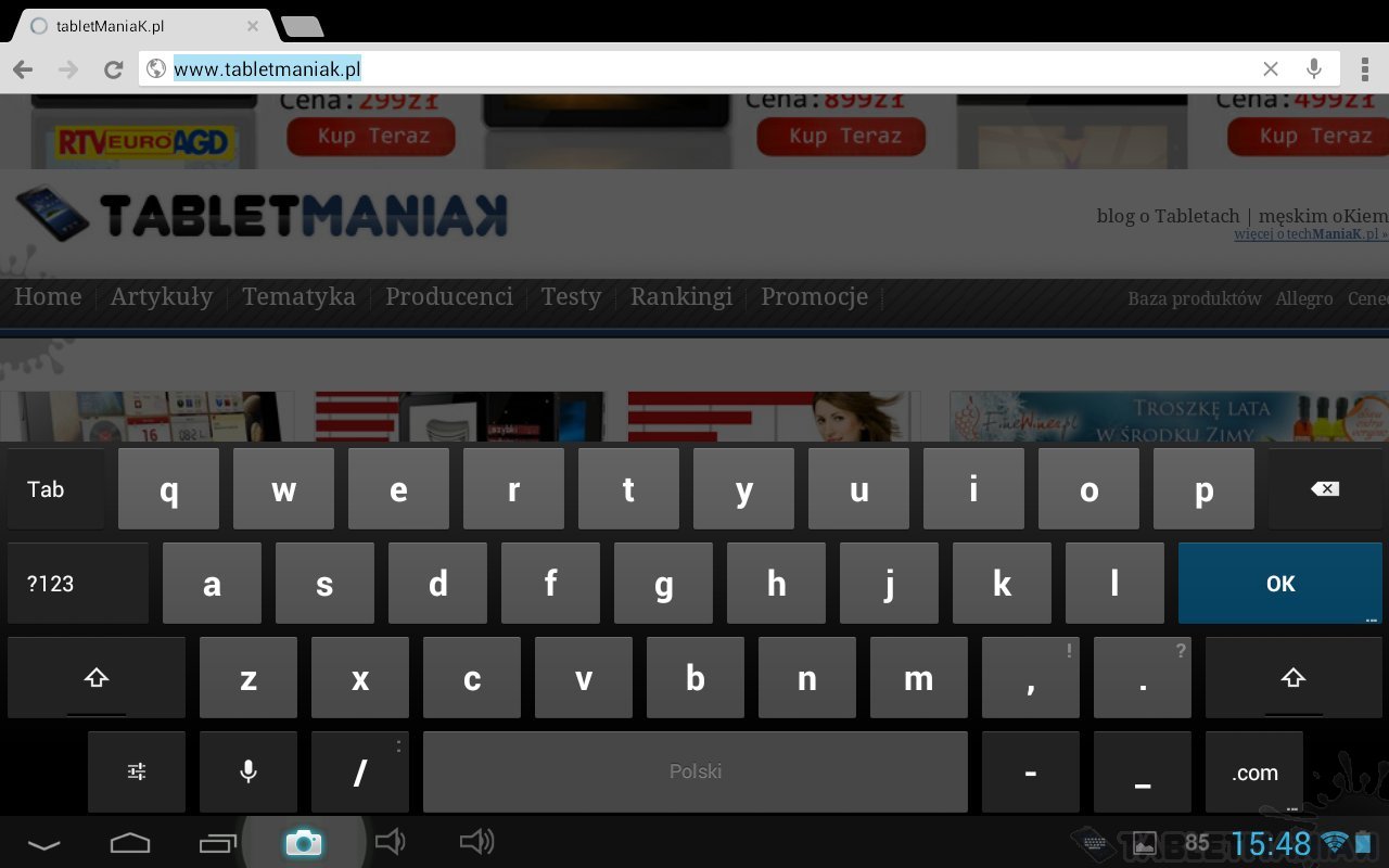 Klawiatura ekranowa składa się z czterech rzędów przycisków. Bez względu na układ, klawisze są równomiernie rozłożone na całej szerokości wyświetlacza. Z uwagi na panoramiczny format tabletu, w praktyce klawiatura jest wygodna tylko przy układzie horyzontalnym. Po obróceniu tabletu o 90 stopni, przyciski stają są zbyt zbite, co trochę obniża komfort pracy. W układzie pionowym urządzenie jest dobrym narzędziem do czytania PDFów i przeglądania stron, do pisania lepiej raczej korzystać z układu poziomego – zwłaszcza że sprzęt obsługuje multidotyk do 10 punktów.