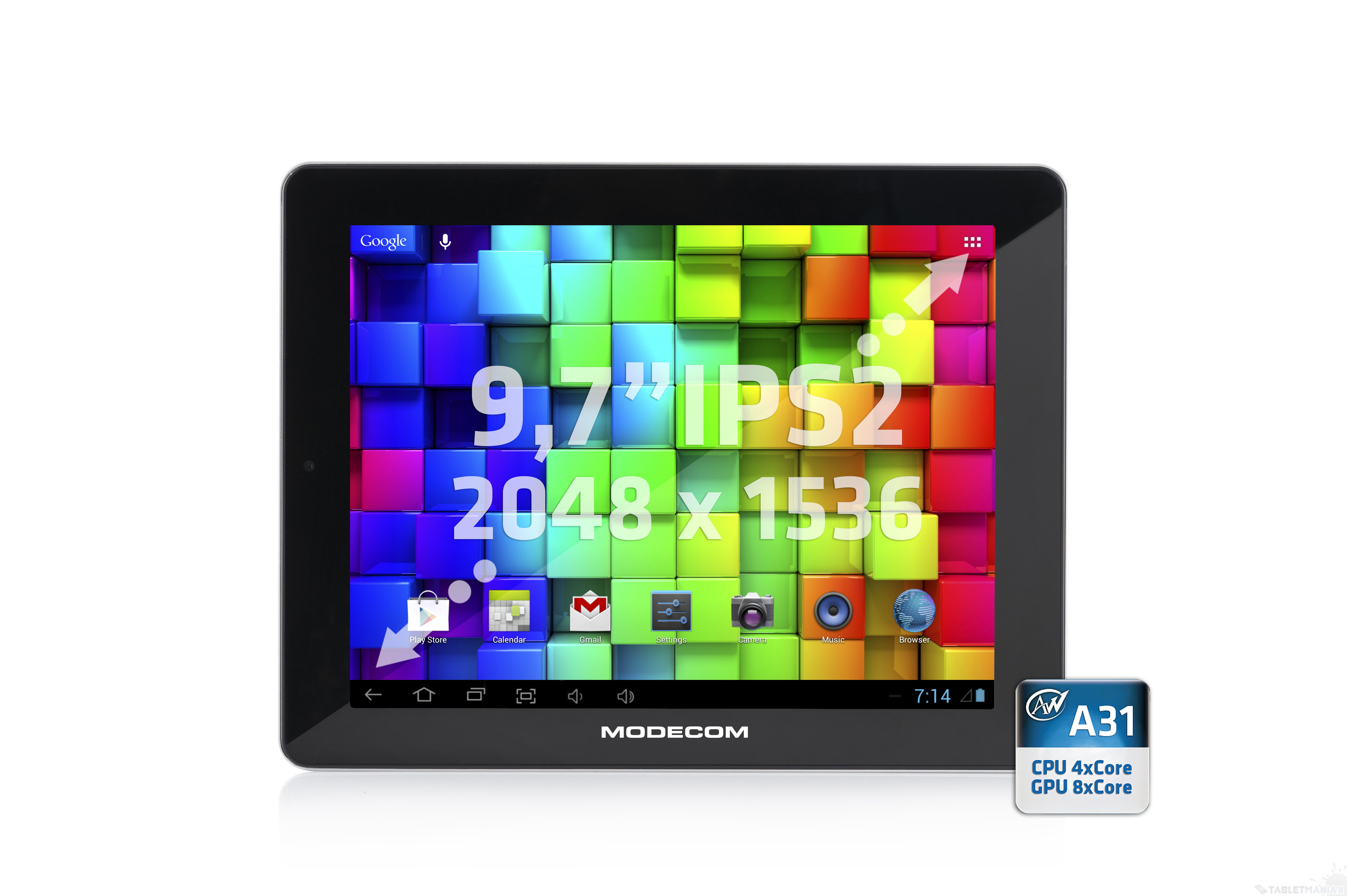 MODECOM FreeTAB 9704 IPS2 X4 zostanie wyposażony w 9.7-calowy wyświetlacz IPS2 o rozdzielczości 2048 x 1536 pikseli (264ppi). Za jego wydajność odpowiadać będzie 4-rdzeniowy procesor AllWinner A31 (Cortex A7) o częstotliwości taktowania 1.0 GHz z 8-rdzeniowym układem graficznym PowerVR SGX544MP2, wspomagany przez 2-gigabajtową pamięć operacyjną RAM DDR3, zaś na dane i multimedia zarezerwowano 16 GB wbudowanej pamięci.