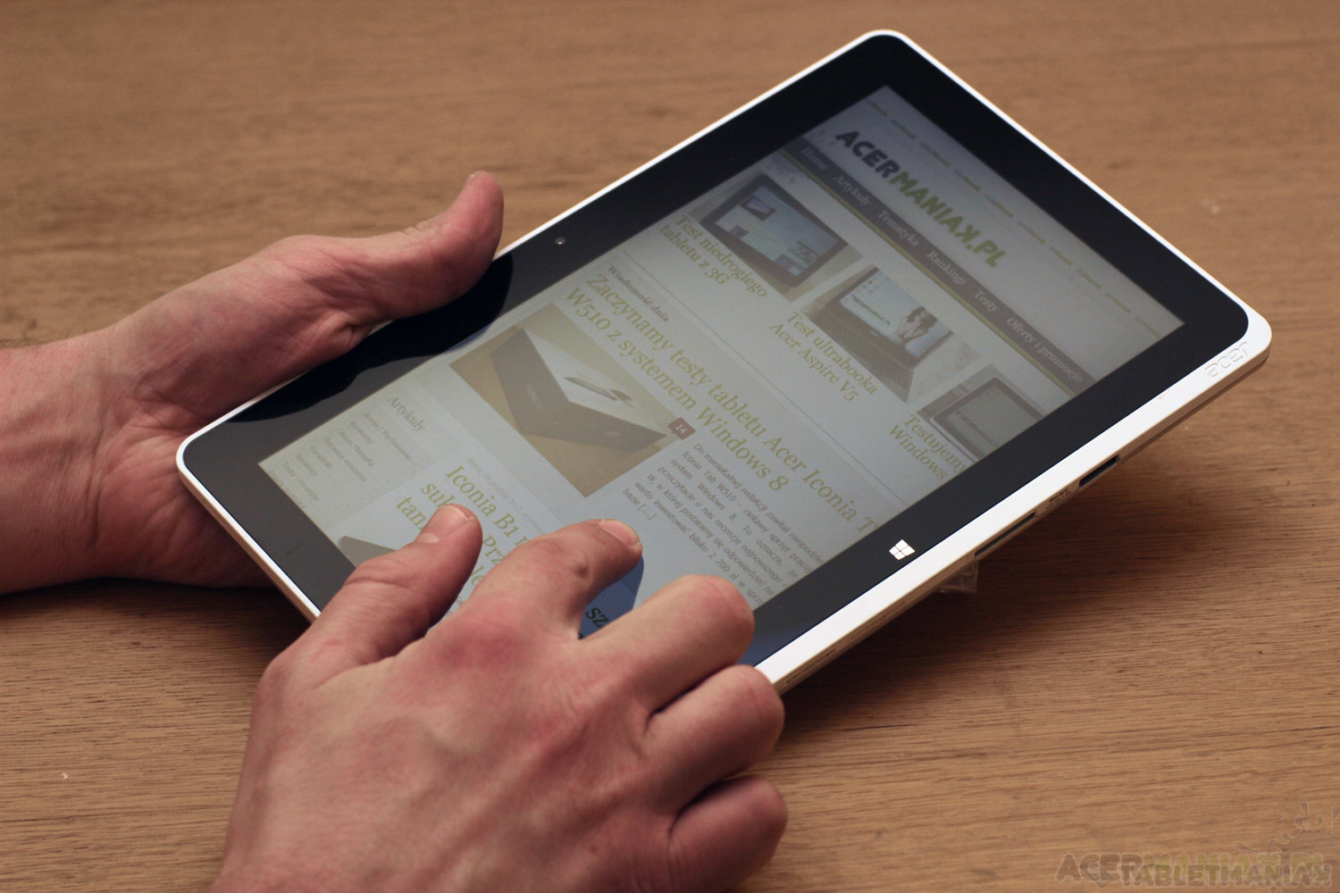 Acer Iconia Tab W510 został wyposażony w ekran IPS (wykonany w technologii CineCrystal), o przekątnej 10,1 cali i rozdzielczości 1366 x 768 pikseli. Kąty widzenia są dobre, a jakość obrazu i równomierność podświetlenia w pełni zadowalające – maksymalne odchyły sięgają 10 cd/m2. Ekran obsługuje technologię multidotyku z pięcioma punktami nacisku. Czujnik został poprawnie skalibrowany, a sam panel cechuje się przyzwoitym czasem reakcji. Efekt “jacuzzi” (charakterystyczne bąble powietrza pod ekranem) widoczny jest dopiero przy mocnym dotknięciu wyświetlacza. Do dyspozycji mamy zestaw klasycznych gestów rozpoznawanych przez system bezbłędnie.