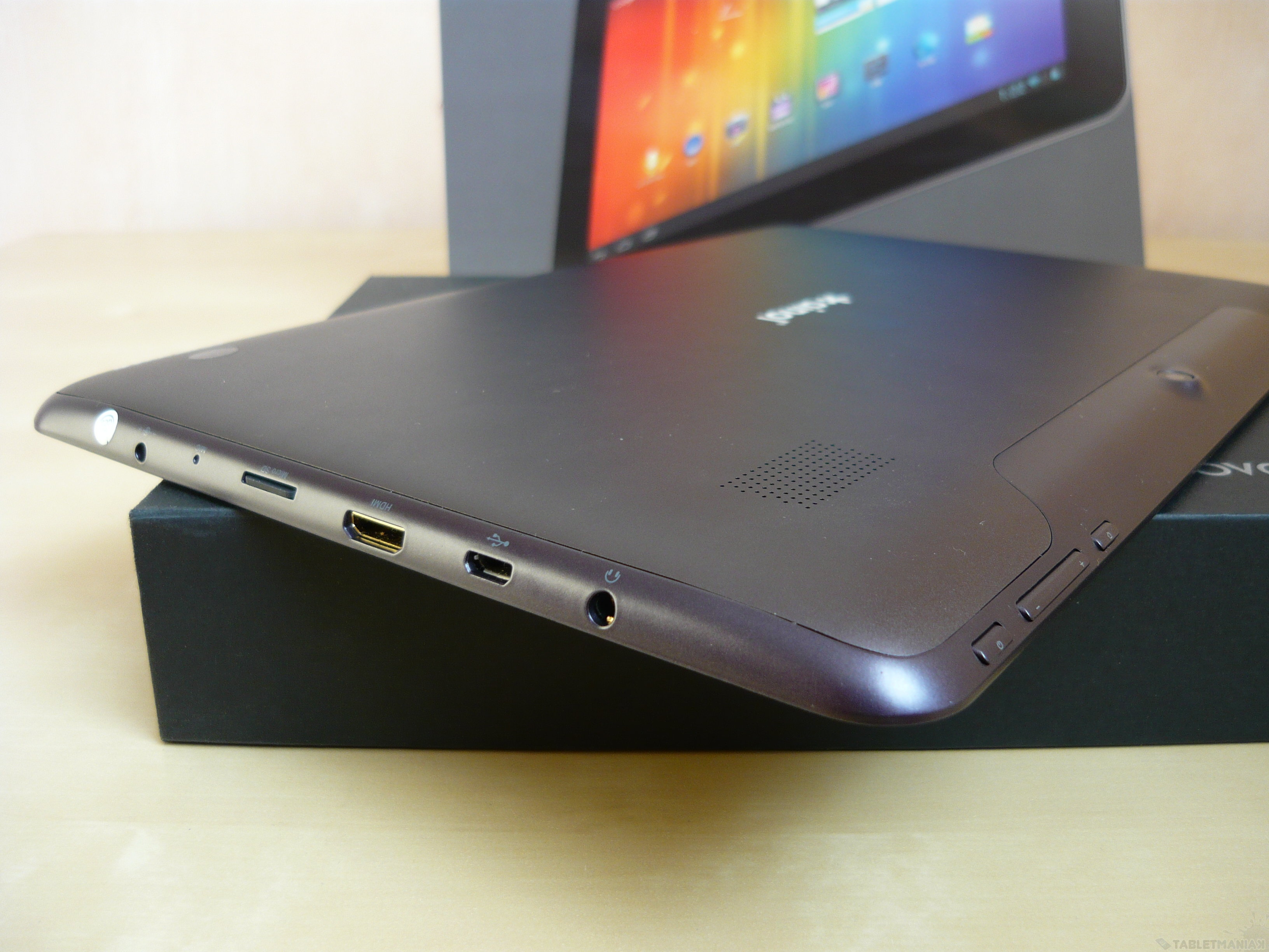 Ainol Novo 10 Hero II pod względem wykonania nie budzi żadnych zastrzeżeń – nie uświadczymy tu żadnych trzasków ani skrzypnięć. Nieco dziwi tylko duża, tylna pokrywa akumulatora, w którą wpuszczony został 10.1-calowy wyświetlacz. Całość prezentuje się jednak interesująco – zwłaszcza z uwagi na śliwkową kolorystykę, która jest rzadko spotykana w tabletach. Oczywiście wrażenia estetyczne oraz design to rzecz gustu, jednak jeżeli miałbym patrzeć tylko tymi kategoriami, Hero II pozostałby z pewnością u mnie na dłużej. Obudowa skonstruowana została przede wszystkim z aluminium – wyjątkiem są gruba ramka okalająca oraz powłoka ochraniająca wyświetlacz (wykonane z tworzywa sztucznego). Ta ostatnia podczas mocniejszego nacisku co prawda nie ugina się, ale tworzy na ekranie efekt rozmycia.