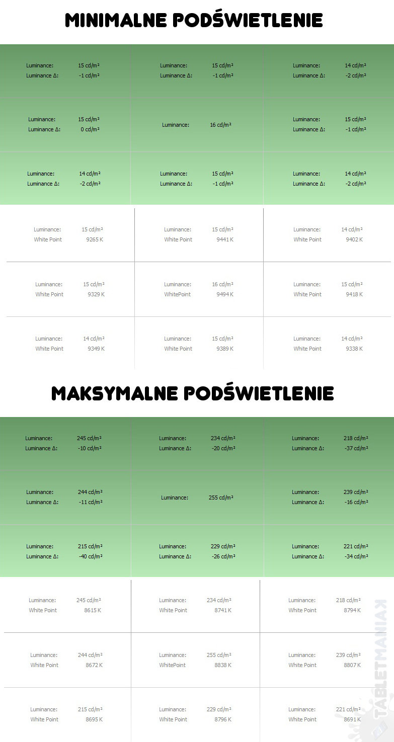 Możemy liczyć na satysfakcjonującą jasność około 250 cd/m2, przy 100-procentowej sile podświetlenia. Nieco gorzej jest z równomiernością podświetlenia, bowiem odchyły sięgają 16%. Warto za to wspomnieć o tym, że siłę podświetlenia możemy zmieniać płynnie w bardzo szerokim zakresie, przy czym najmniejsza wartość to już 16 cd/m2. Na pokładzie nie znajdziemy czujnika oświetlenia. Matryca nie migoce w żadnym punkcie, nie zauważyłem również przebarwień i „martwych pikseli”.
