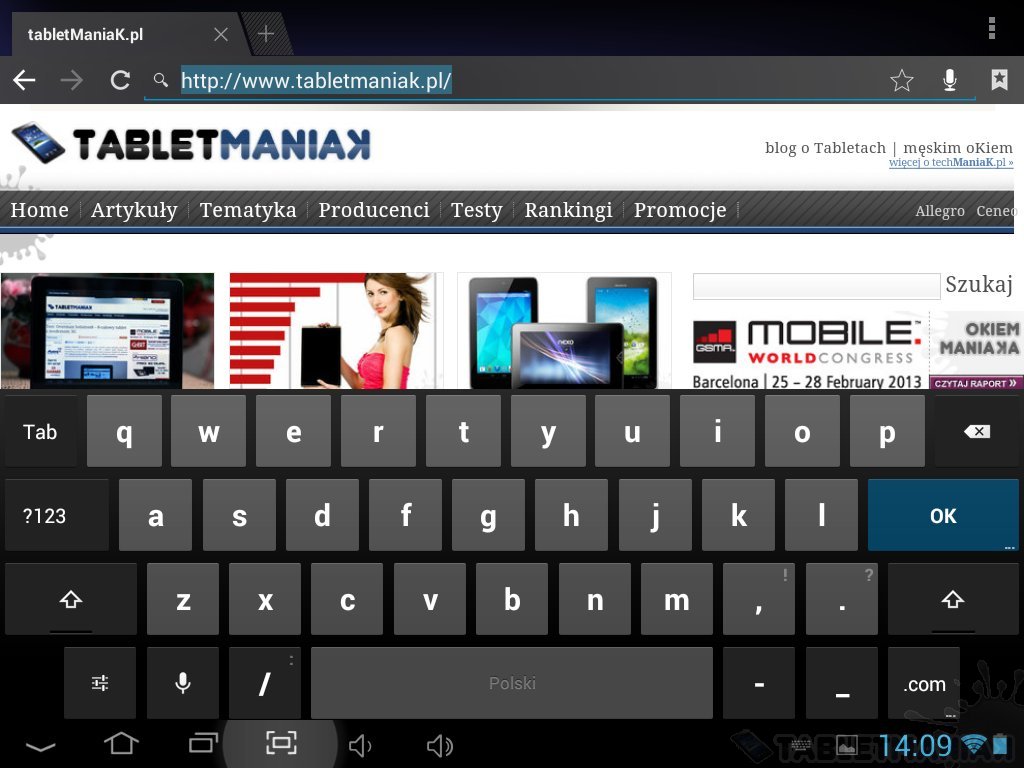 Klawiatura ekranowa składa się z czterech rzędów przycisków. Bez względu na układ, klawisze są równomiernie rozłożone na całej szerokości wyświetlacza. Po obróceniu tabletu o 90 stopni urządzenie jest dobrym narzędziem do czytania PDFów i przeglądania stron, do pisania lepiej raczej korzystać z układu poziomego – zwłaszcza że sprzęt obsługuje multidotyk do 10 punktów.