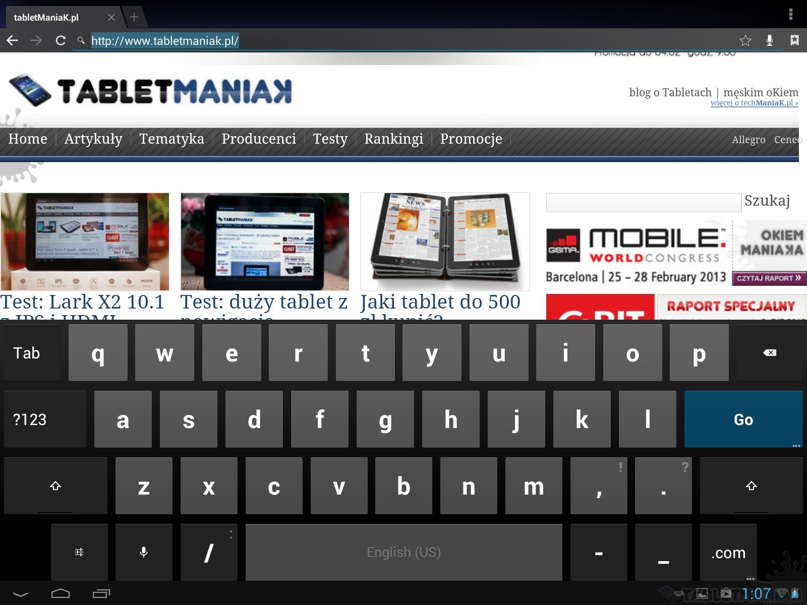 Klawiatura ekranowa składa się z czterech rzędów przycisków. Bez względu na układ, klawisze są równomiernie rozłożone na całej szerokości wyświetlacza. Z uwagi na format ekranu 4:3 najlepiej korzystać z układu horyzontalnego przy pisaniu (potencjalnych użytkowników powinna przy tym ucieszyć obsługa 10-punktowego multidotyku umożliwiającego szybkie wstukiwanie znaków), natomiast po obróceniu tabletu o 90 stopni urządzenie jest dobrym narzędziem do czytania PDFów i przeglądania stron internetowych.