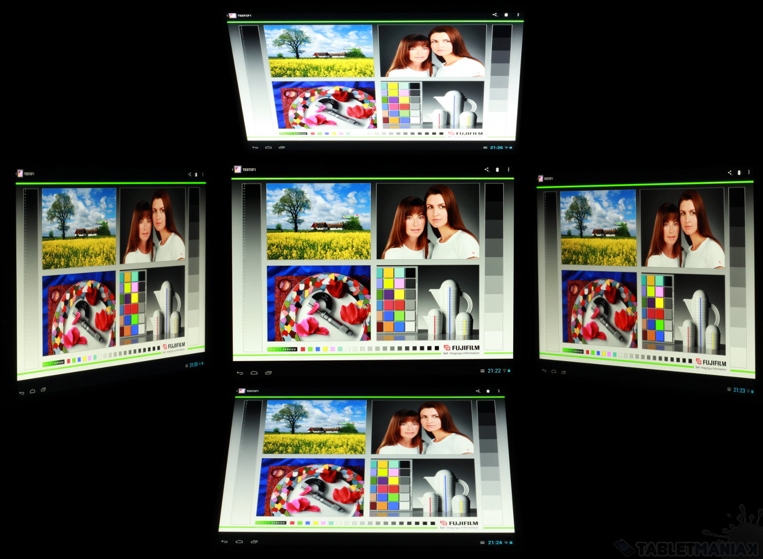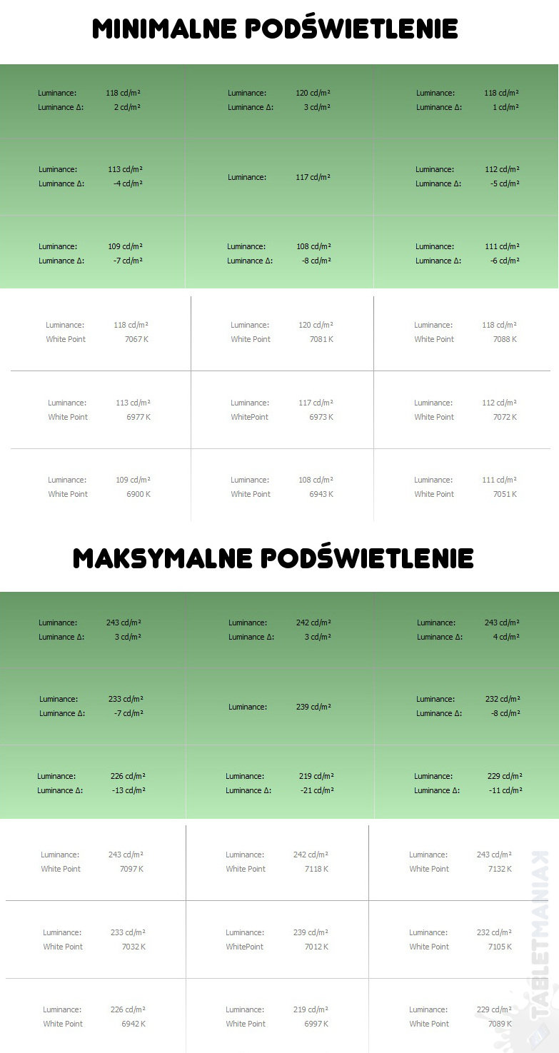 Możemy liczyć na około 240 cd/m2 przy 100-procentowej sile podświetlenia (to wartość przeciętna ale wystarczająca do komfortowej pracy z tabletem), a odchyły sięgają 8%, mieszcząc się w akceptowalnych granicach. Siłę podświetlenia możemy zmieniać płynnie, przy czym najmniejsza wartość to około 120 cd/m2. Już taki poziom podświetlenia, w połączeniu z panelem ISP o wysokim kontraście, jest satysfakcjonujący podczas pracy w pomieszczeniach. Na pokładzie nie znajdziemy czujnika oświetlenia. Matryca nie migoce w żadnym punkcie, nie odnotowaliśmy także w egzemplarzu testowym „martwych pikseli”.