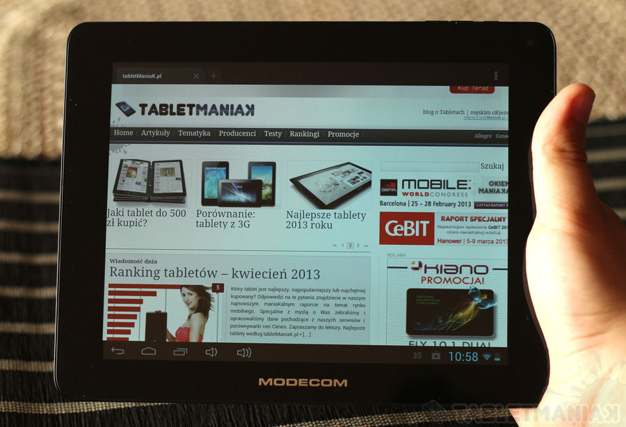 Witam, przed kilkoma dniami nabyłem ten sprzęt, myślałem o wymianie używanego od prawie 2 lat Ideosie S7 SLIM na coś nowszego/lepszego, wybór padł na Modecom-a. Skusiła mnie cena (udało się kupić za 450 zł), ekran IPS, pamięć oraz działający flash player. Myślałem, że mój egzemplarz jest wadliwy (chodzi o baterie, wifi i łączność 3G), jednak po przeczytaniu Waszych komentarzy wiem, że „ten typ tak ma”. Bateria, nie ma co komentować, po prostu tragedia, łączność poprzez wifi porażka, ściana/sufit na drodze router – tablet to przeszkoda nie do pokonania, łączność 3G jest możliwa tylko i wyłącznie na zewnątrz budynku i to nie zawsze. Ikony zasięgu GSM/3G są szare, dopiero po połączeniu się z routerem zmieniają kolor na niebieski, dodatkowo nie mogę wysłać kodów USSD.
