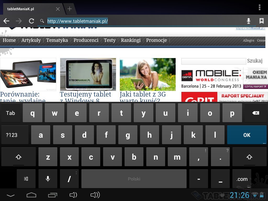 Klawiatura ekranowa składa się z czterech rzędów przycisków. Bez względu na układ, klawisze są równomiernie rozłożone na całej szerokości wyświetlacza. Po obróceniu tabletu o 90 stopni urządzenie jest dobrym narzędziem do czytania PDFów i przeglądania stron, do pisania lepiej raczej korzystać z układu poziomego.