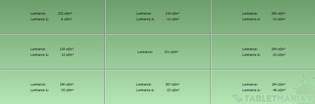 Maksymalna jasność matrycy to około 231 cd/m2, przy 100-procentowej sile podświetlenia, przy czym nierównomierność podświetlenia sięga 20%. Jasność możemy zmieniać płynnie w szerokim zakresie, przy czym najmniejsza wartość to 42 cd/m2. Na pokładzie nie znajdziemy czujnika oświetlenia. Podczas pracy nie zauważymy nierównomierności podświetlenia, migania matrycy (nawet podczas ładowania) oraz widocznych zniekształceń obrazu. Odwzorowanie kolorów plasuje się na średnim poziomie.