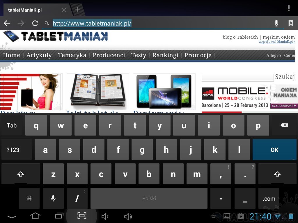 Klawiatura ekranowa składa się z czterech rzędów przycisków. Bez względu na układ, klawisze są równomiernie rozłożone na całej szerokości wyświetlacza. Po obróceniu tabletu o 90 stopni urządzenie jest dobrym narzędziem do czytania PDFów i przeglądania stron, do pisania lepiej raczej korzystać z układu poziomego – zwłaszcza, że sprzęt obsługuje multidotyk do 10 punktów.