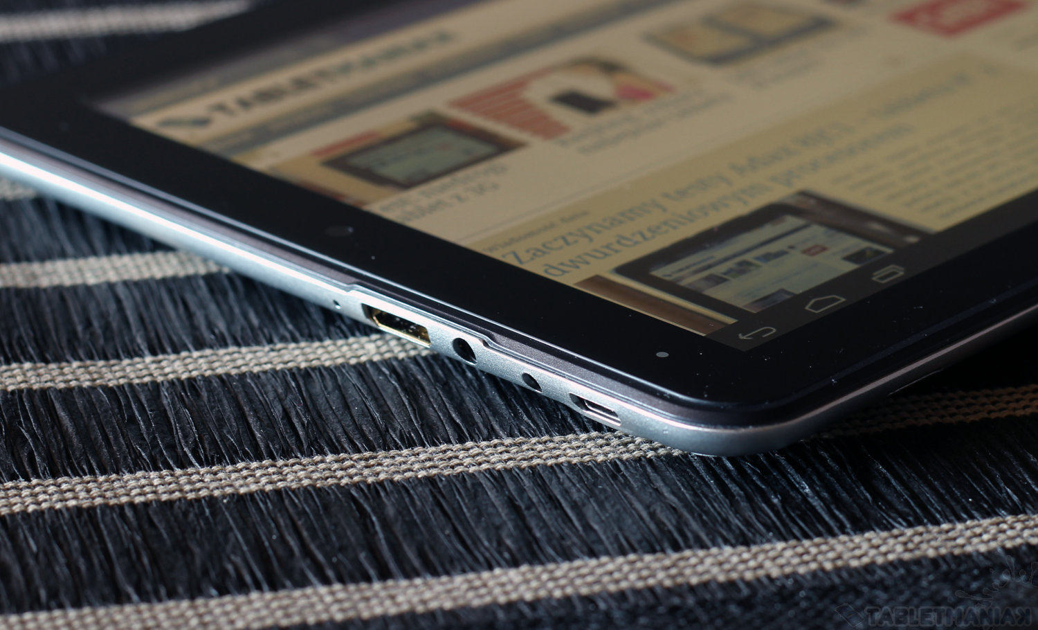 W obudowie tabletu można wyróżnić dwie części. Front jest przykryty szklaną taflą ochronną i łączy się bezpośrednio z tylnym panelem z pominięciem ścianek bocznych. Spód został wykrojony z aluminium co zwiększyło nieco wagę urządzenia, ale podwyższyło trwałość i nadało konstrukcji odpowiednią sztywność. Jakość wykonania na pierwszy rzut oka stoi na solidnym poziomie. Nic nie trzeszczy i nie skrzypi pod naciskiem. Warto też zwrócić uwagę na obecność złącza HDMI, dzięki któremu podłączymy tablet do większego ekranu.