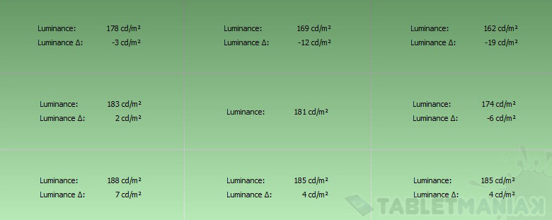 Maksymalna jasność matrycy to około 181 cd/m2, przy 100-procentowej sile podświetlenia, przy czym nierównomierność podświetlenia sięga 14%. Jasność możemy zmieniać płynnie w szerokim zakresie, przy czym najmniejsza wartość to 41 cd/m2. Matryca nie migoce w żadnym punkcie, nie zauważyłem również przebarwień i „martwych pikseli”.