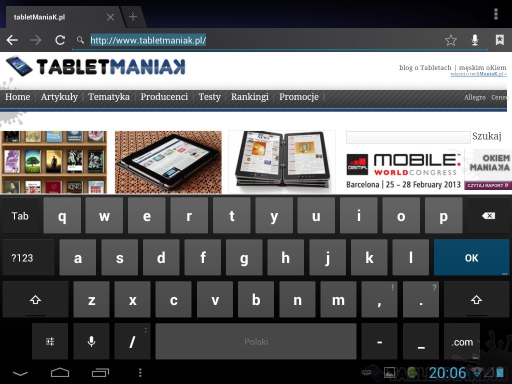 Klawiatura ekranowa składa się z czterech rzędów przycisków. Bez względu na układ, klawisze są równomiernie rozłożone na całej szerokości wyświetlacza. Po obróceniu tabletu o 90 stopni urządzenie jest dobrym narzędziem do czytania PDFów i przeglądania stron, do pisania lepiej raczej korzystać z układu poziomego.