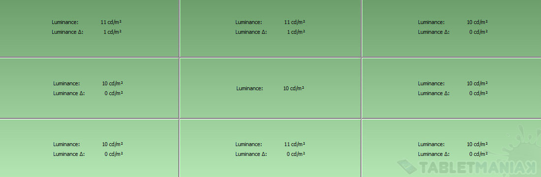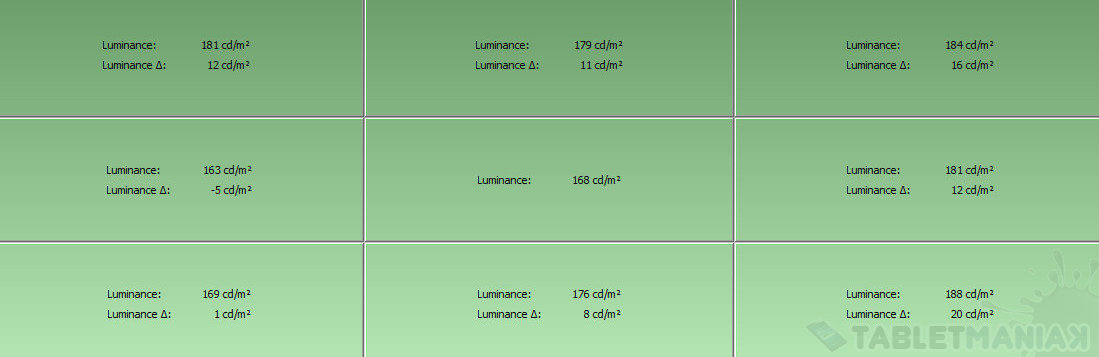 Maksymalna jasność matrycy to około 168 cd/m2, przy 100-procentowej sile podświetlenia, przy czym nierównomierność podświetlenia sięga 15%. Jasność możemy zmieniać płynnie w bardzo szerokim zakresie, a najmniejsza wartość to 10 cd/m2. Na pokładzie nie znajdziemy czujnika oświetlenia. Matryca nie migoce w żadnym punkcie, nie zauważyłem również przebarwień i „martwych pikseli”.